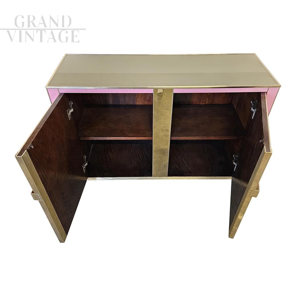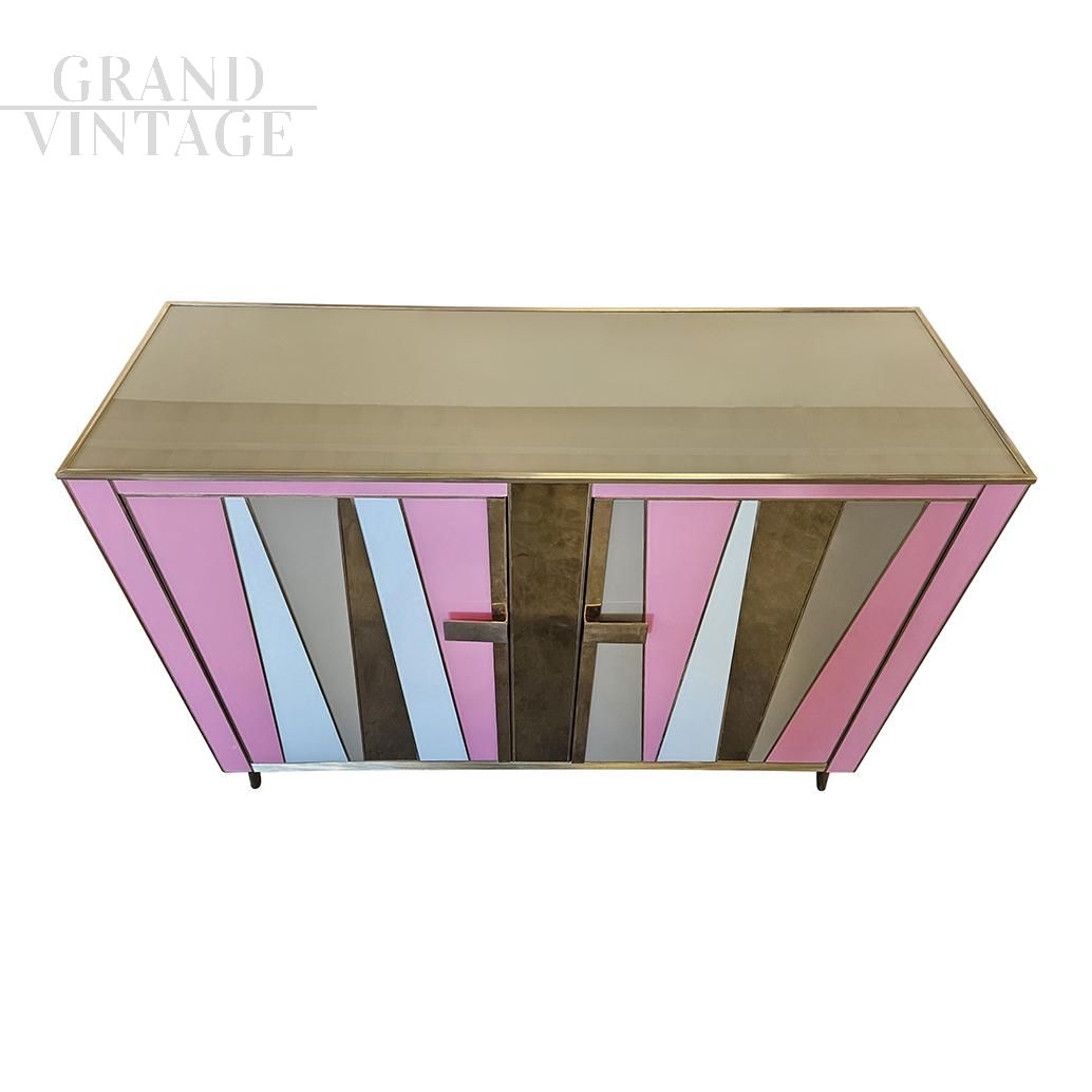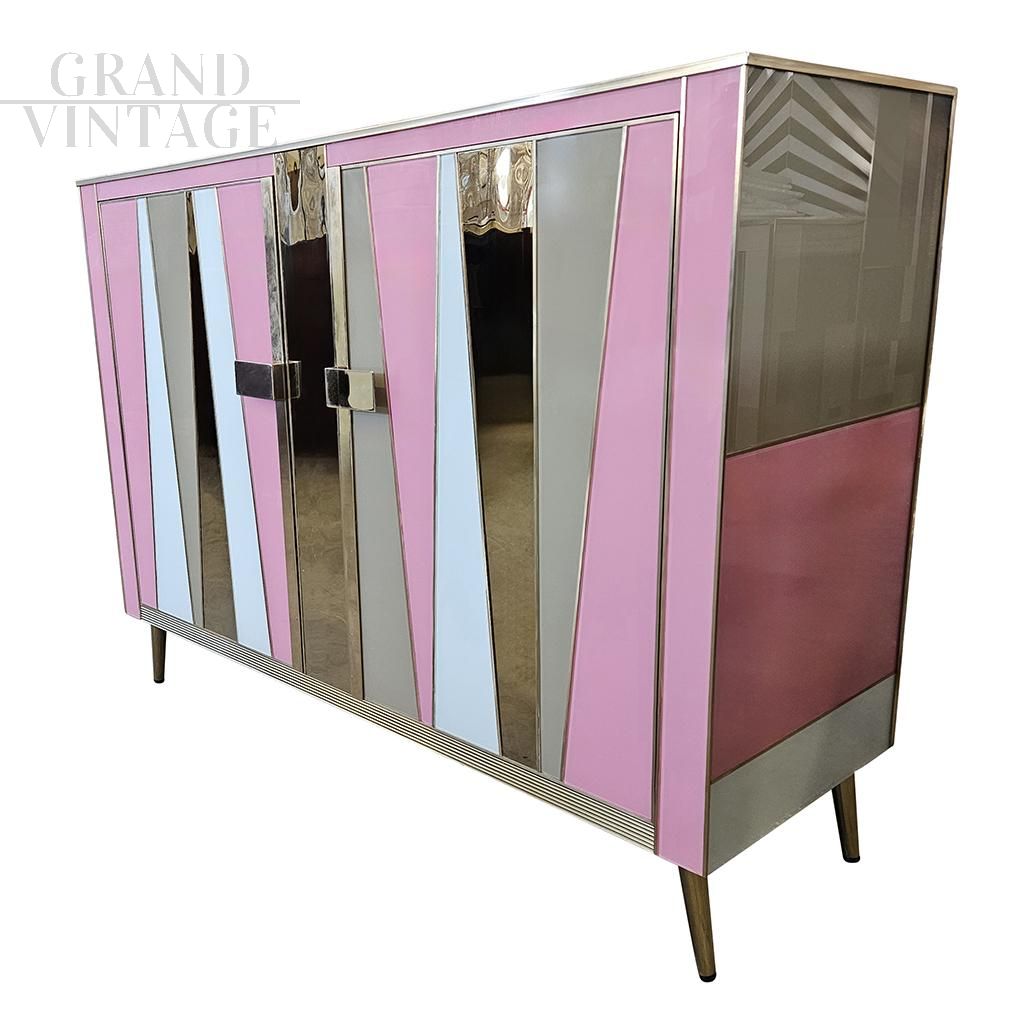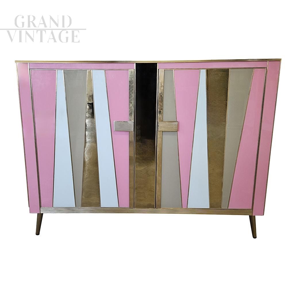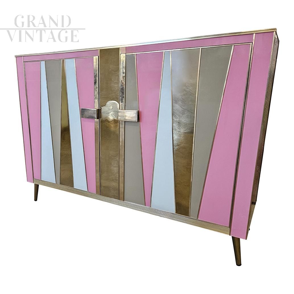 Two-door sideboard entirely handmade with wooden structure covered in pink and gray Murano glass, enriched with brass decorations; profiles, handles and feet in golden brass. Glass top. Internal wooden shelf.