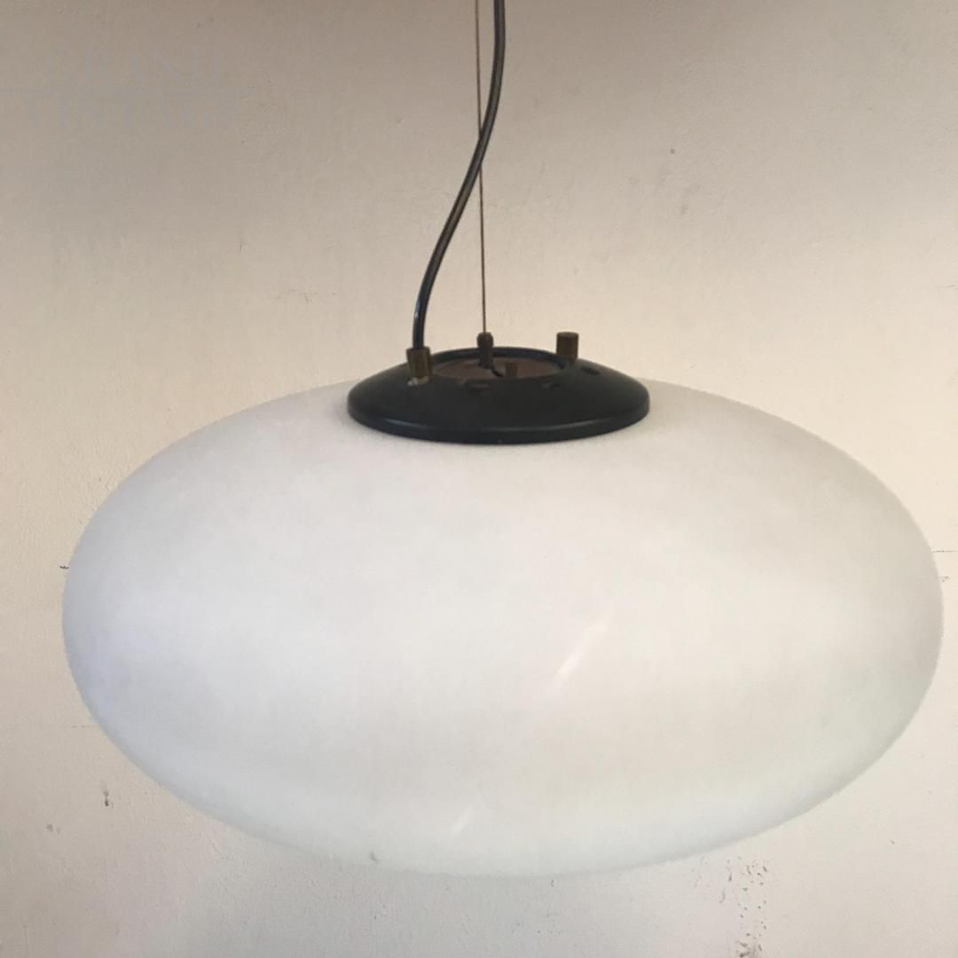 Ufo Stilnovo suspension lamp, 1960s modern style, in black lacquered brass and opal glass.