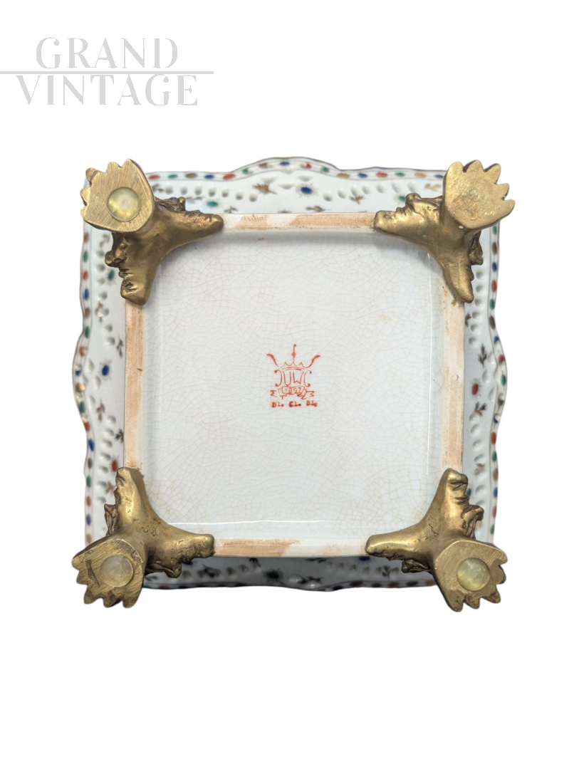 An elegant enameled porcelain centerpiece, crafted by the renowned United Wilson factory (mark visible on the bottom), active in Hong Kong in the 19th and 20th centuries and known for producing fine Oriental-style objects for the European market. This refined creation features a flared, quadrangular shape with wavy edges, decorated with polychrome enamels and gilding, in a riot of floral and geometric motifs typical of 19th-century Oriental style. The interior and exterior of the bowl are finely crafted, with ornamental fretwork that lends a sense of lightness and prestige to the piece. Dimensions: 10 x 20 x 20 cm (height, width, depth)