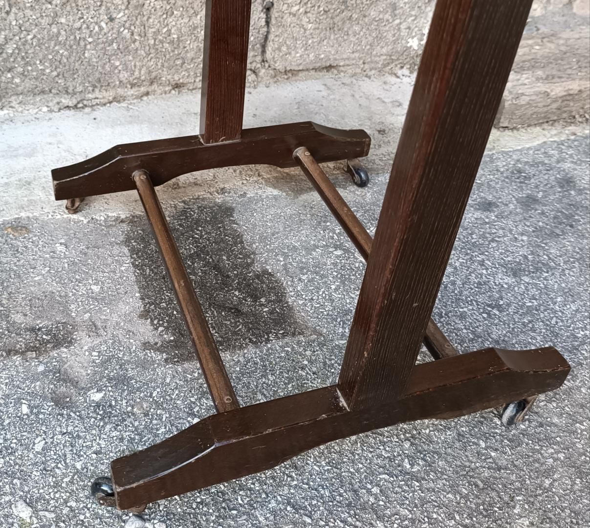 Valet stand by Fratelli Reguitti attributed to the designer Ico Parisi in mahogany, with 1 vertical axis to comfortably support jacket and trousers, retractable brass wings, for ties, complete with 4 rubber wheels, to be able to move it as desired. Object from the 50s with slight signs of aging, but in excellent condition, manufacturer's mark present. Resistant, very light and removable with just 2 screws located in the lower part.