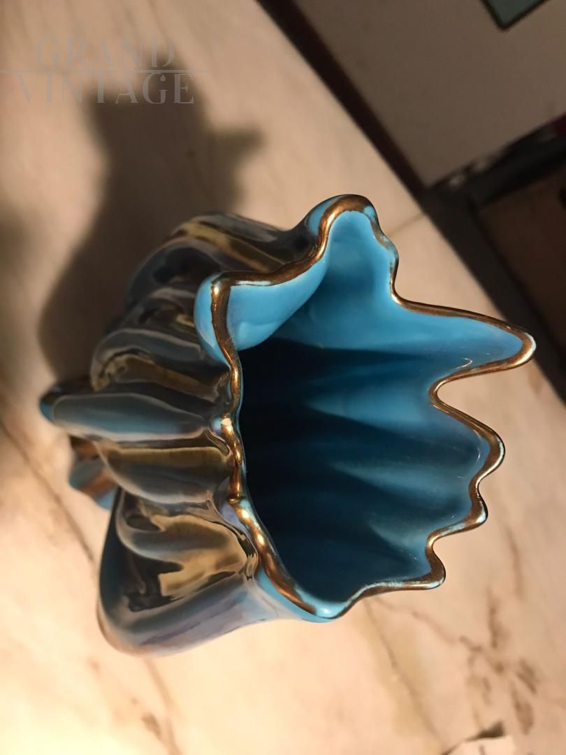 Vintage design vase by SICAS in light blue Sesto Fiorentino ceramic with intense gold details and streaks, 1950s, numbered 657. Excellent condition, no damage or defect.