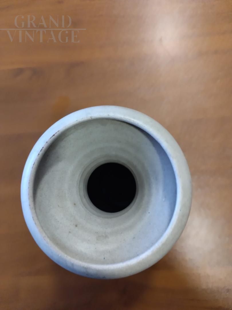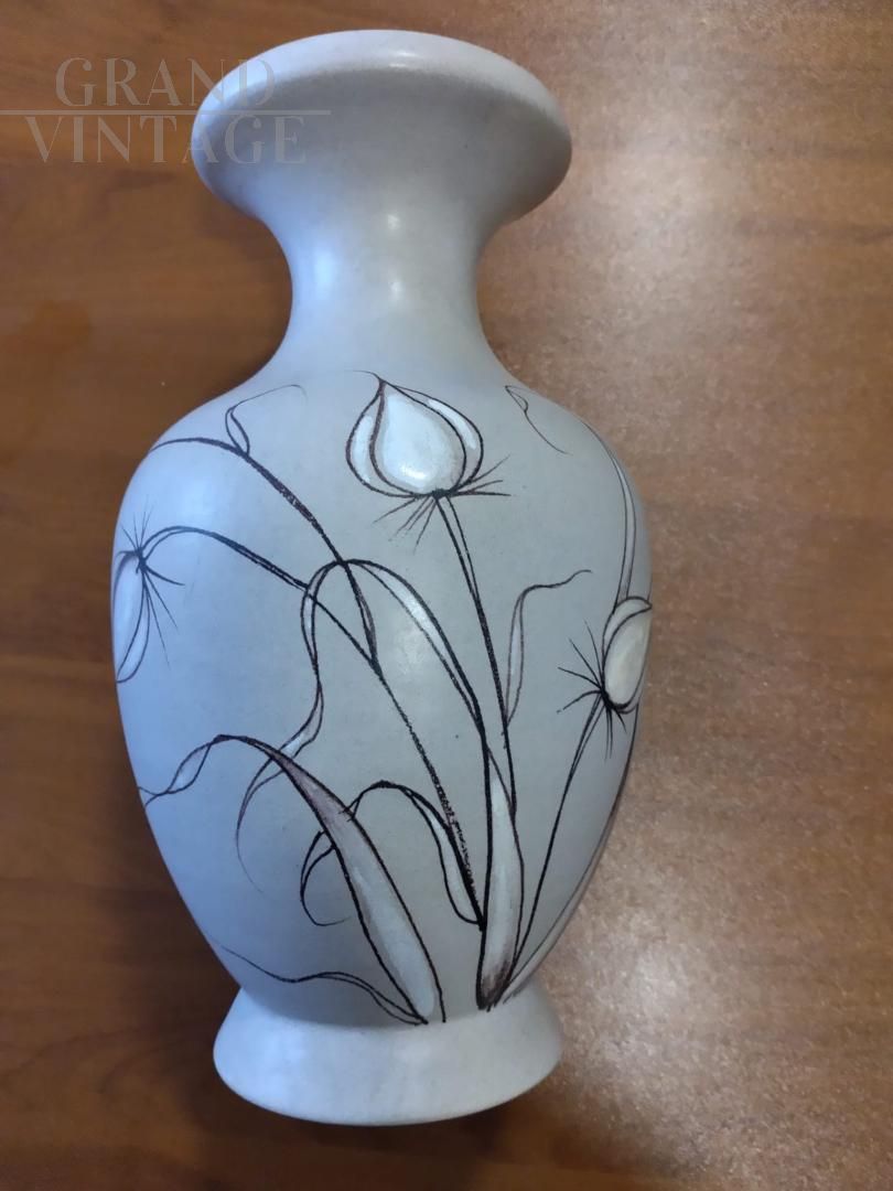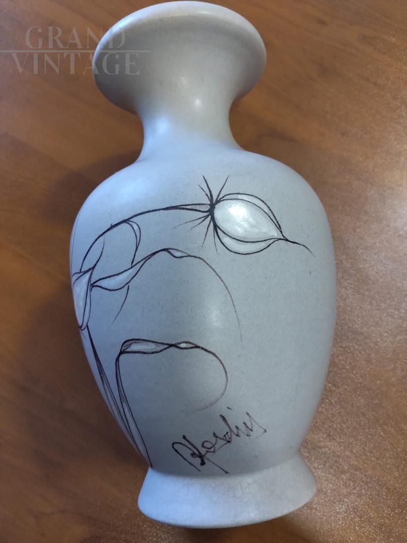 Stunning vintage ceramic vase worked and painted by hand, signed Daniele Foschi, made in the 1970s in Gradara, an antique medieval village located in the Marche region on the border with Emilia Romagna in the province of Pesaro Urbino, where the artist runs the ceramics still today since 1973 with dignity and skill, so much so that in recent years it has brought him various awards, not least the diploma of master craftsman art ceramist in 2012.