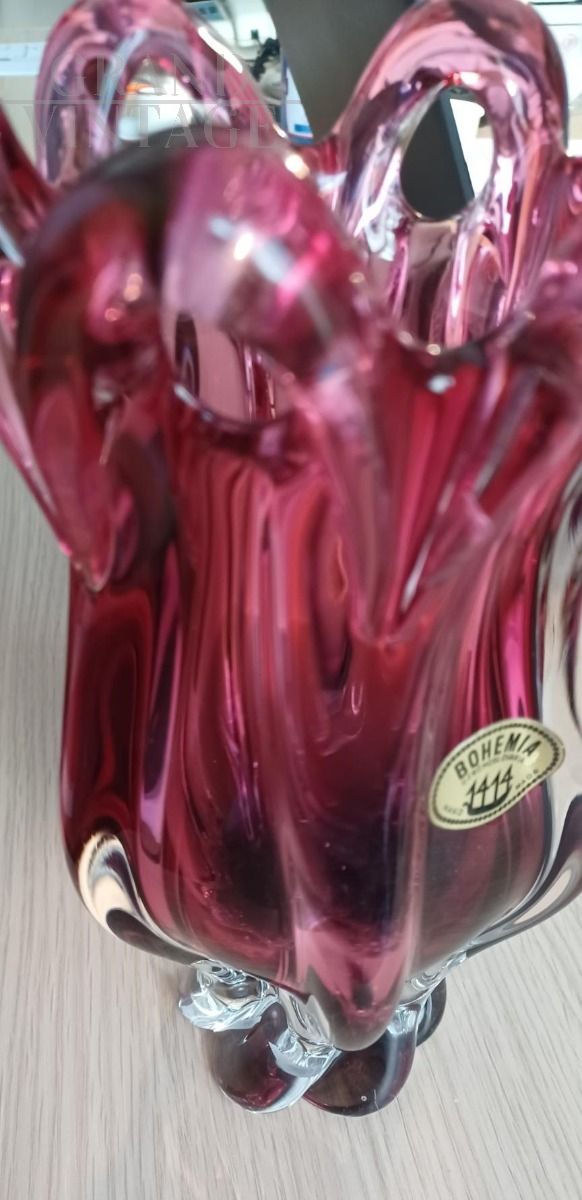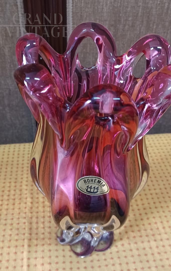 Elegant and original vase by Josef Hospodka in bohemian art glass shaded with amethyst, designed for Chribska Glassworks. The vase is very rare, dating back to the 70s, of the highest quality, with a surprising organic shape in a shade from cranberry to amethyst enclosed in a thick clear glass. Large in size, it measures 25cm high by 10cm wide, with a very significant glass thickness and weight. The vase is in exceptional condition.