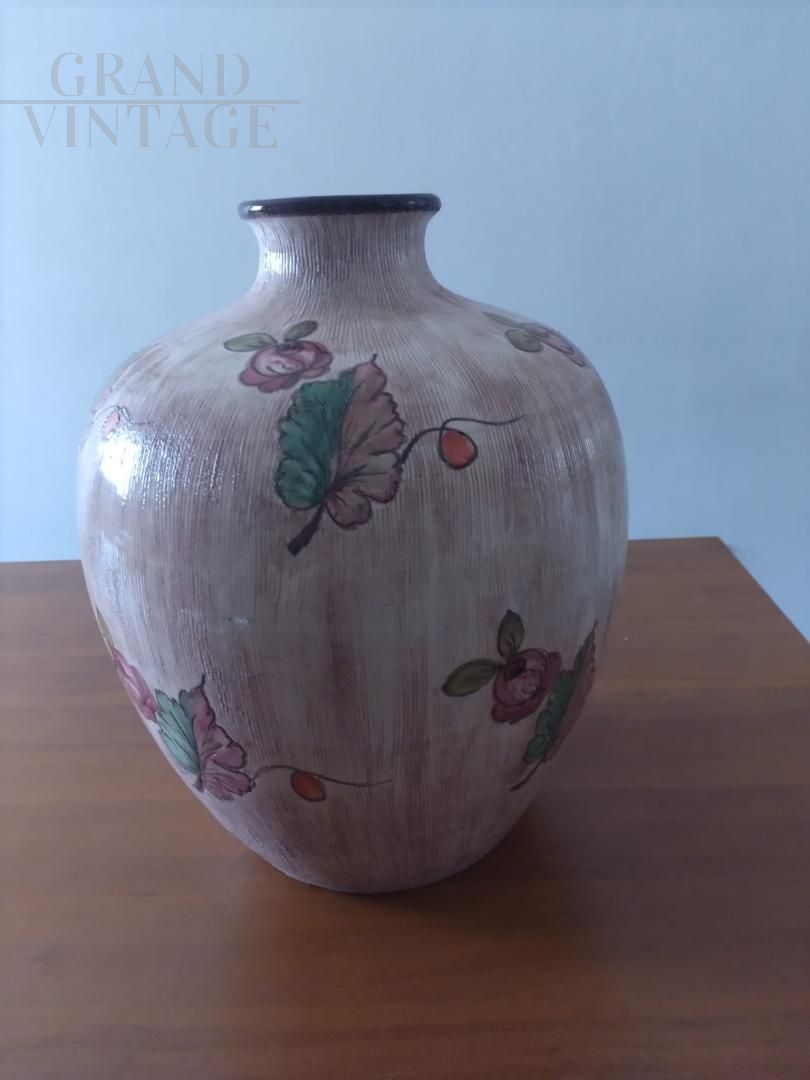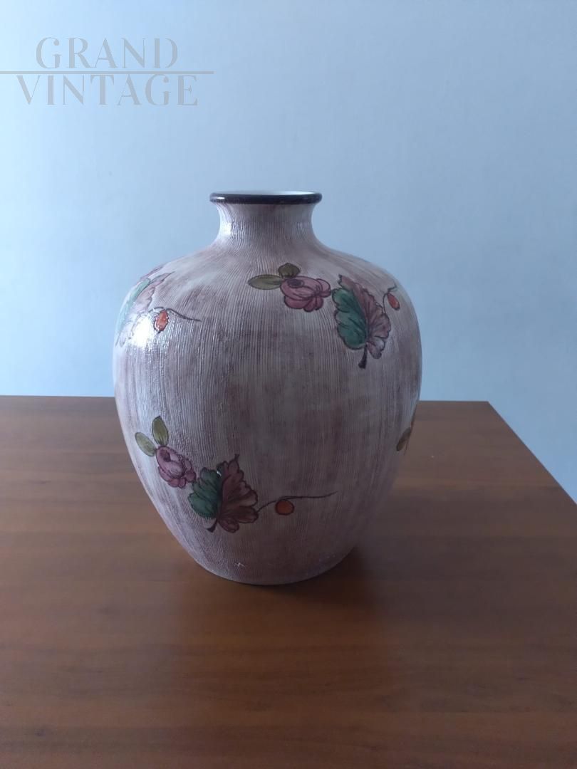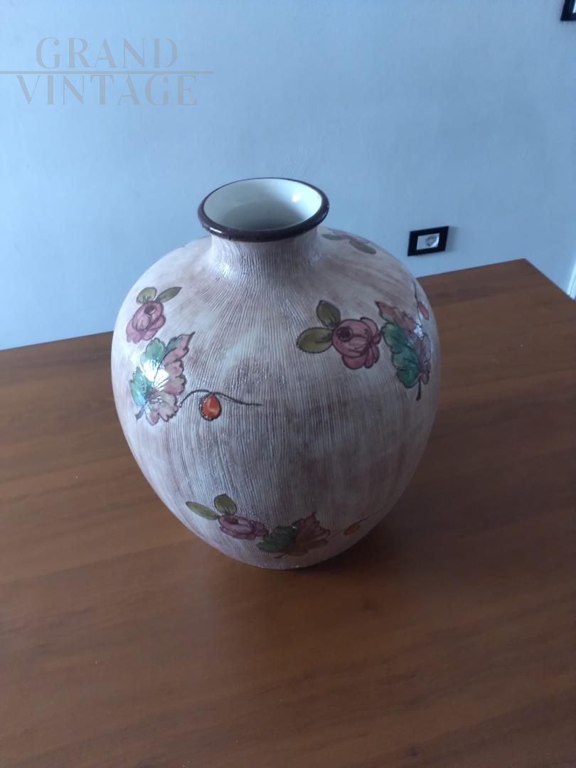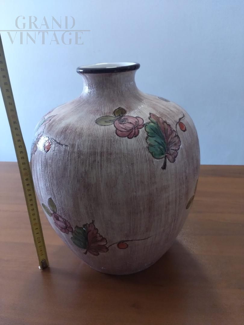 Vintage Italian ceramic vase hand painted with floral motifs.
