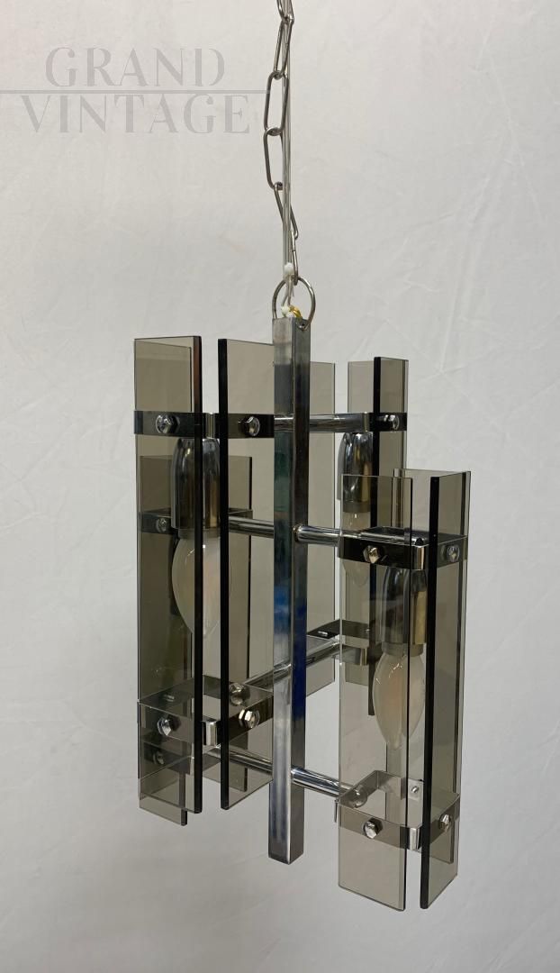 Fantastic chandelier from around the 1970s with hand-cut smoked glass, attributed to the Veca company, all original, with very few signs of wear, electrical system redone and working. Wonderful transparent smoked glass, each glass can be dismantled from the iron supporting structure. The windows are not cracked. Excellent element that can furnish different rooms: from the kitchen to the living room, from the entrance to the bedroom and bathroom. The chandelier has 4 light points with sockets for E14 olive type bulbs, we recommend the use of LED bulbs. The price also includes the restoration carried out by craftsmen who have specialized in this profession for over 30 years.