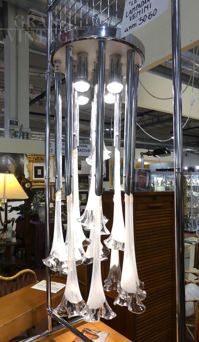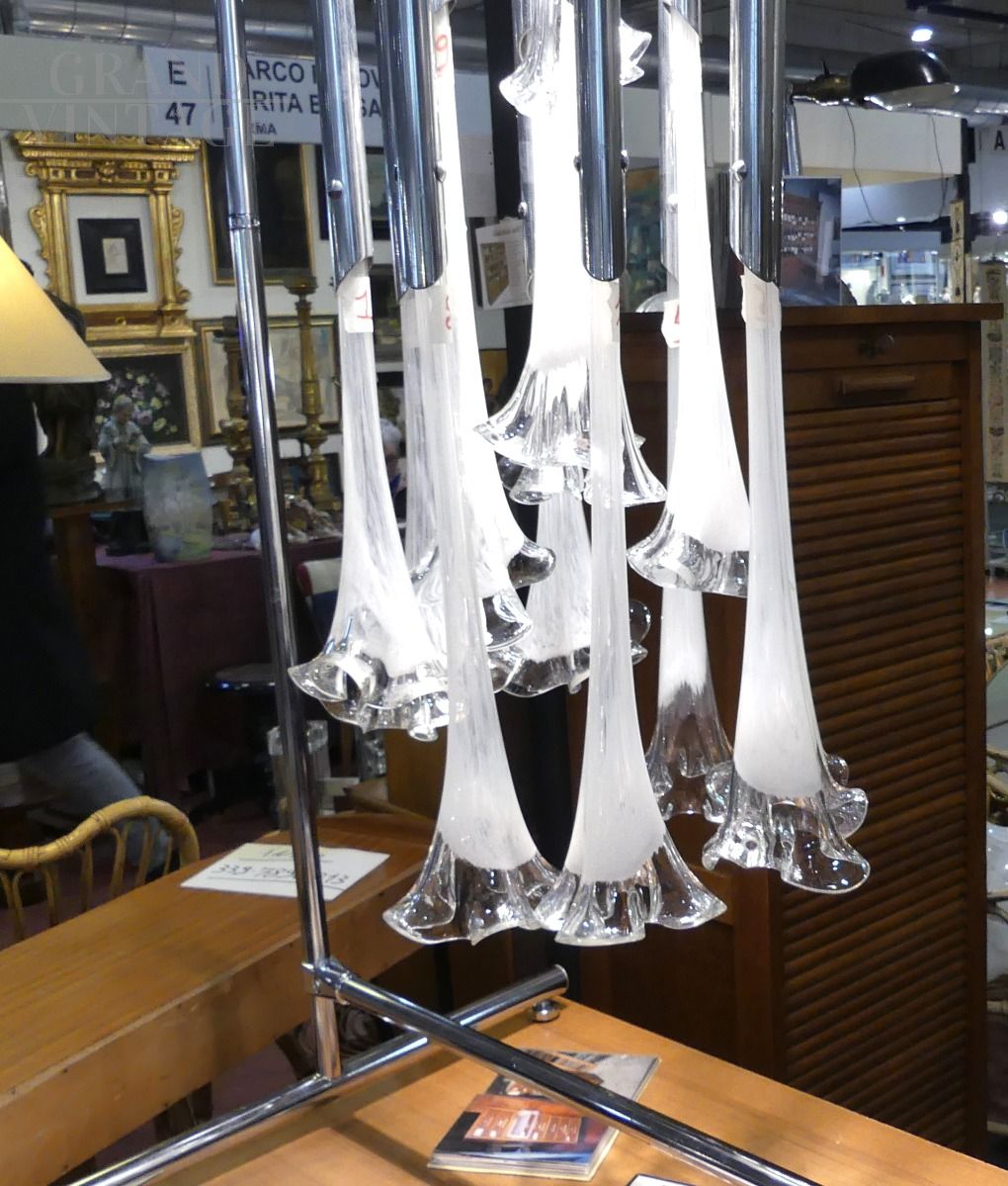 Venini chandelier in transparent and white Murano glass with 16 glasses with floral shapes reminiscent of calla lilies. Support in chromed metal, complete with 4 light points, in excellent condition.