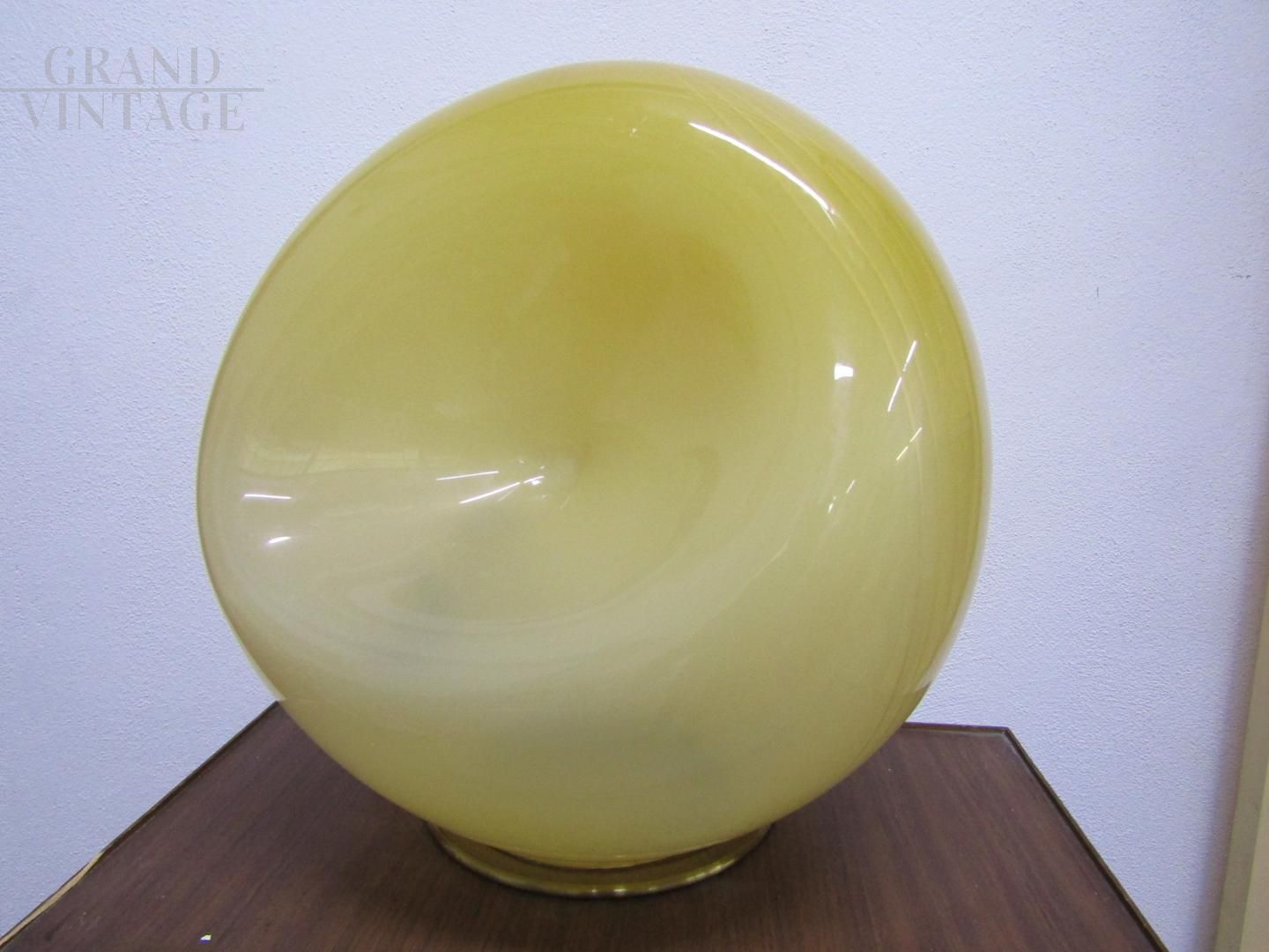 Rare Murano glass table lamp in the style of Carlo Scarpa for Venini, 1940s, in milky yellow globular glass with internal bands that give a beautiful radial effect when switched on.