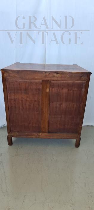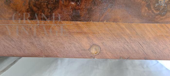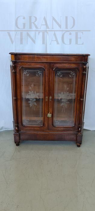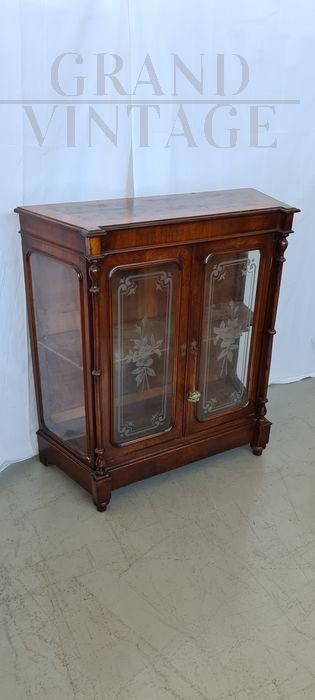 Beautiful Piedmontese showcase in walnut and briar walnut, with glass both on the front and on the sides, the front glasses show a satin floral motif. The cabinet was restored a few years ago, has some scratches and small cracks due to time, has been sanitized and comes from a Milanese apartment where it was used at the entrance.
