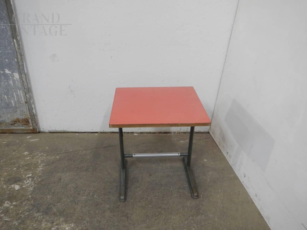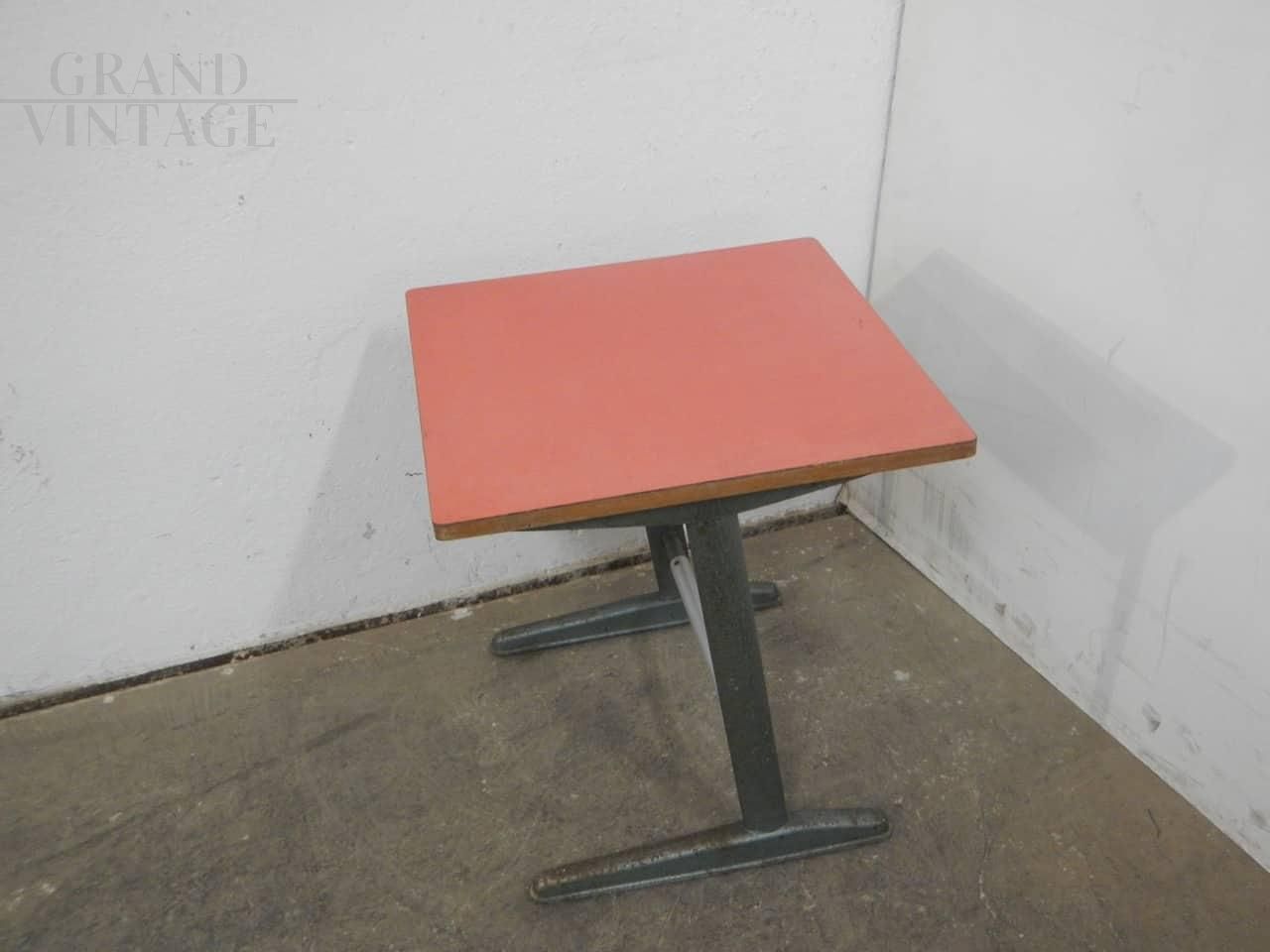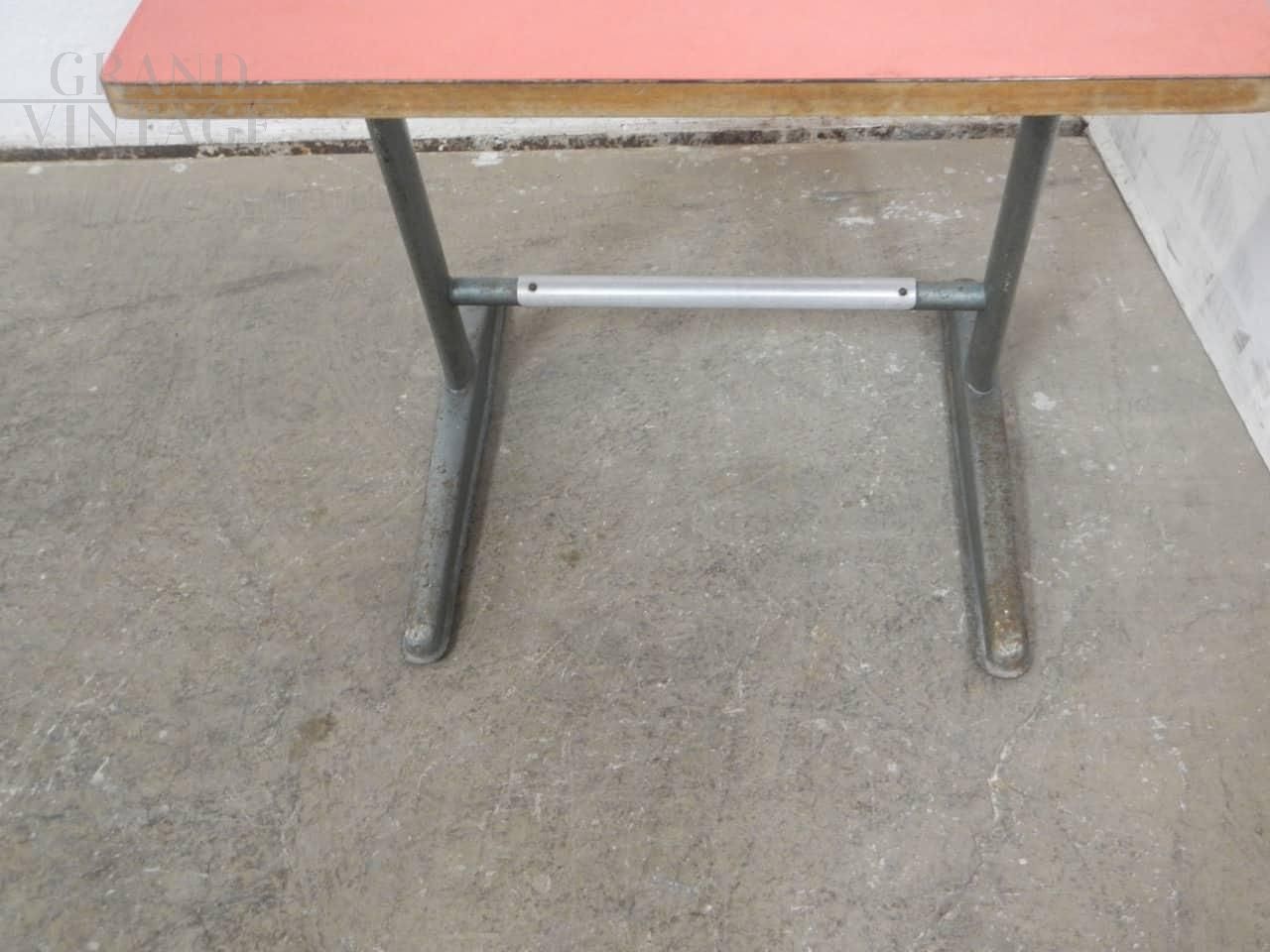 Vintage iron school bench with beech and red formica top and footrest. In good condition, with signs of use.