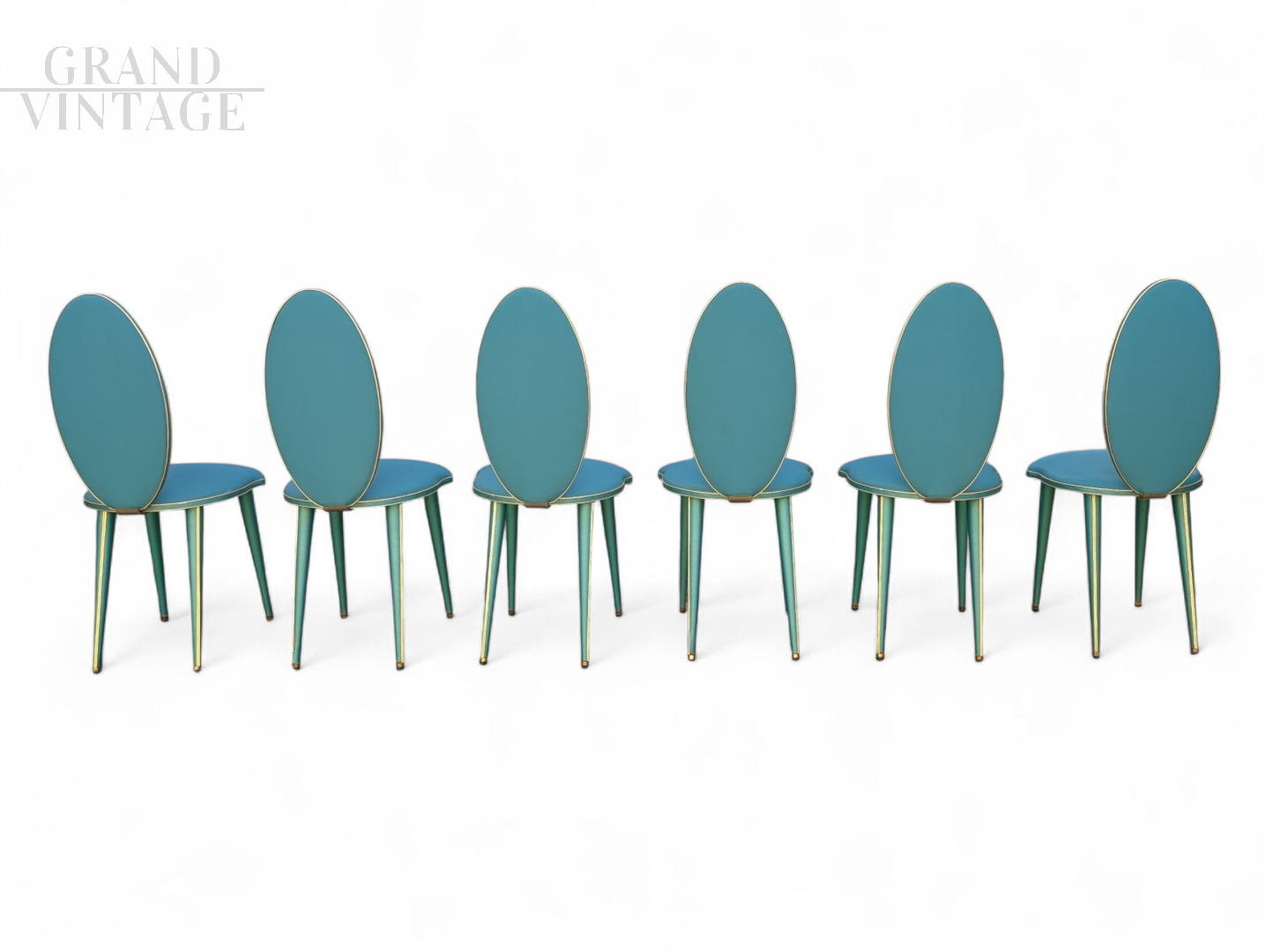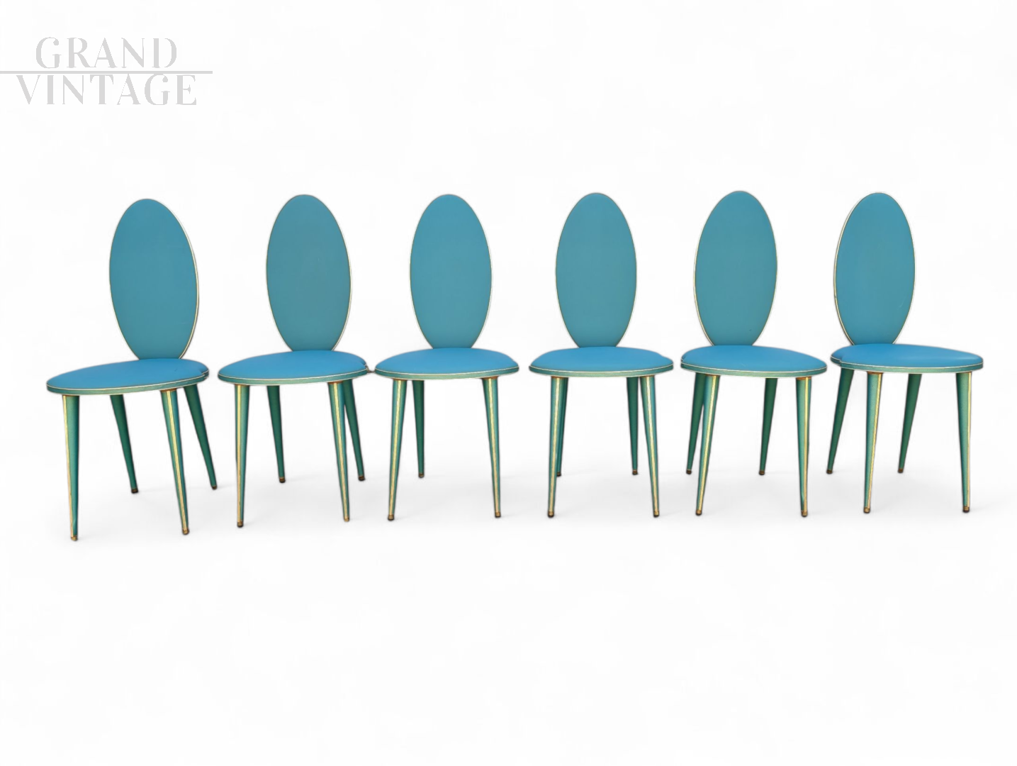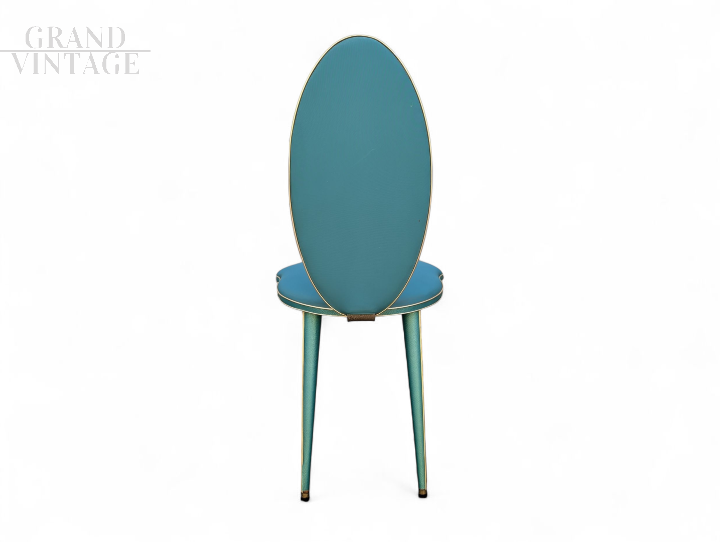These charming dining chairs feature a unique and harmonious design, perfect for adding a touch of elegance and liveliness to any setting. The stylized heart-shaped seat and oval backrest are upholstered in an attractive fabric, lending a uniform and sophisticated look. Each chair is supported by tapered legs, painted a distinctive aqua green and adorned with delicate gold trim. These details not only add a touch of light and sophistication, but also complement the overall aesthetic of the complete set. The thin gold trim around the seat and backrest further emphasizes the sinuous lines of the design.
