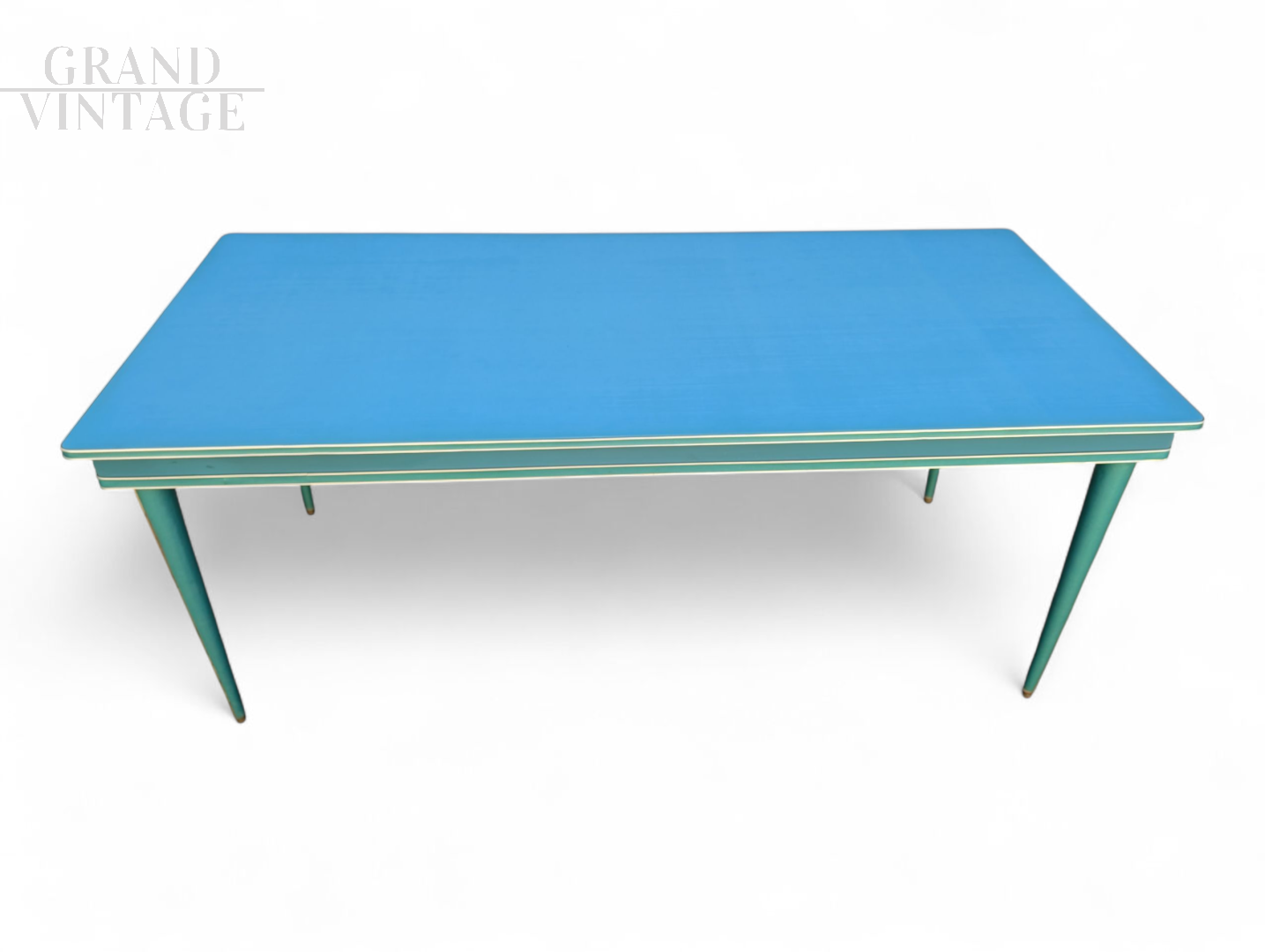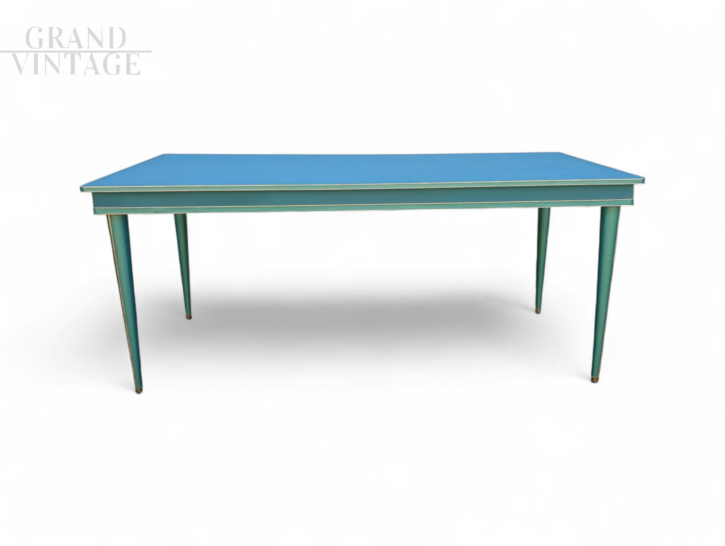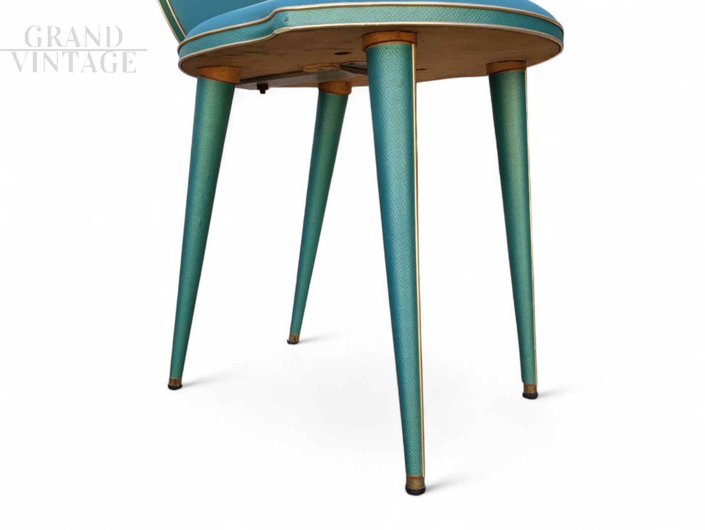 These charming dining chairs feature a unique and harmonious design, perfect for adding a touch of elegance and liveliness to any setting. The stylized heart-shaped seat and oval backrest are upholstered in an attractive fabric, lending a uniform and sophisticated look. Each chair is supported by tapered legs, painted a distinctive aqua green and adorned with delicate gold trim. These details not only add a touch of light and sophistication, but also complement the overall aesthetic of the complete set. The thin gold trim around the seat and backrest further emphasizes the sinuous lines of the design.