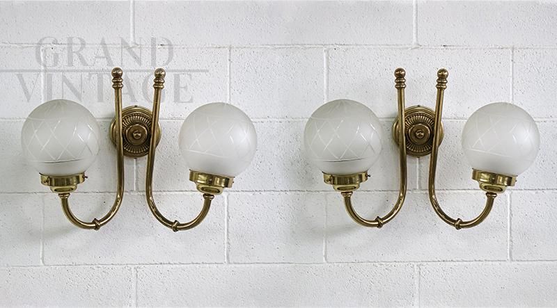 Vintage golden brass wall light with two arms and worked glass sphere lampshades, produced in Italy in the 1950s, compatible with E27 type bulbs.