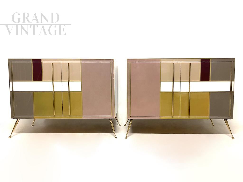 Elegant vintage sideboard from the 1970s, entirely crafted from pastel-colored glass with an illuminated brass trim. Inside, it features a shelf and is fully lined in gray velvet and brass. Origin: Italy, 1970s. Available as a pair; the price is for each piece.