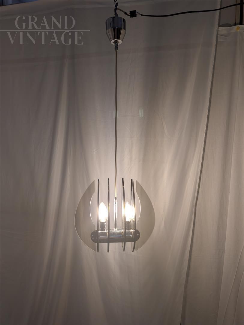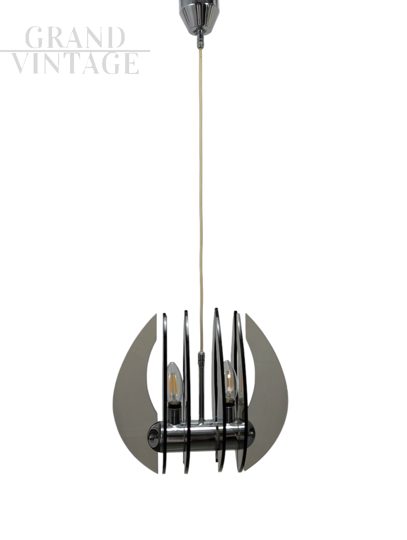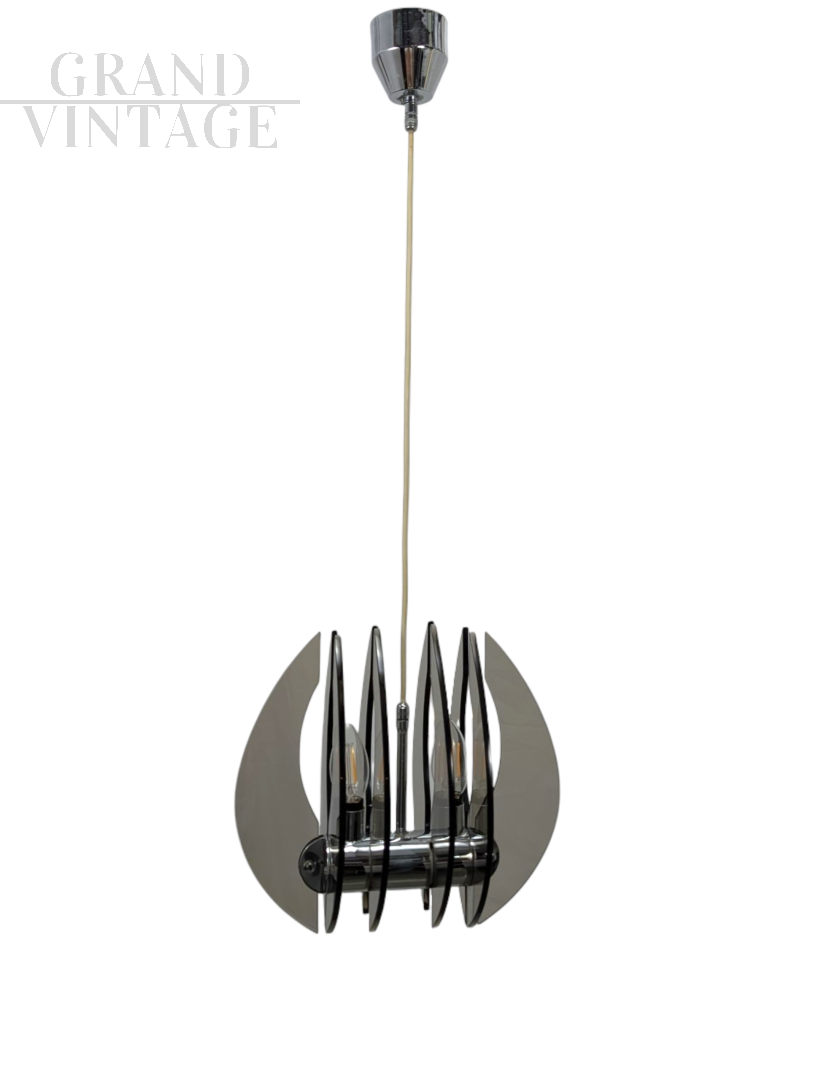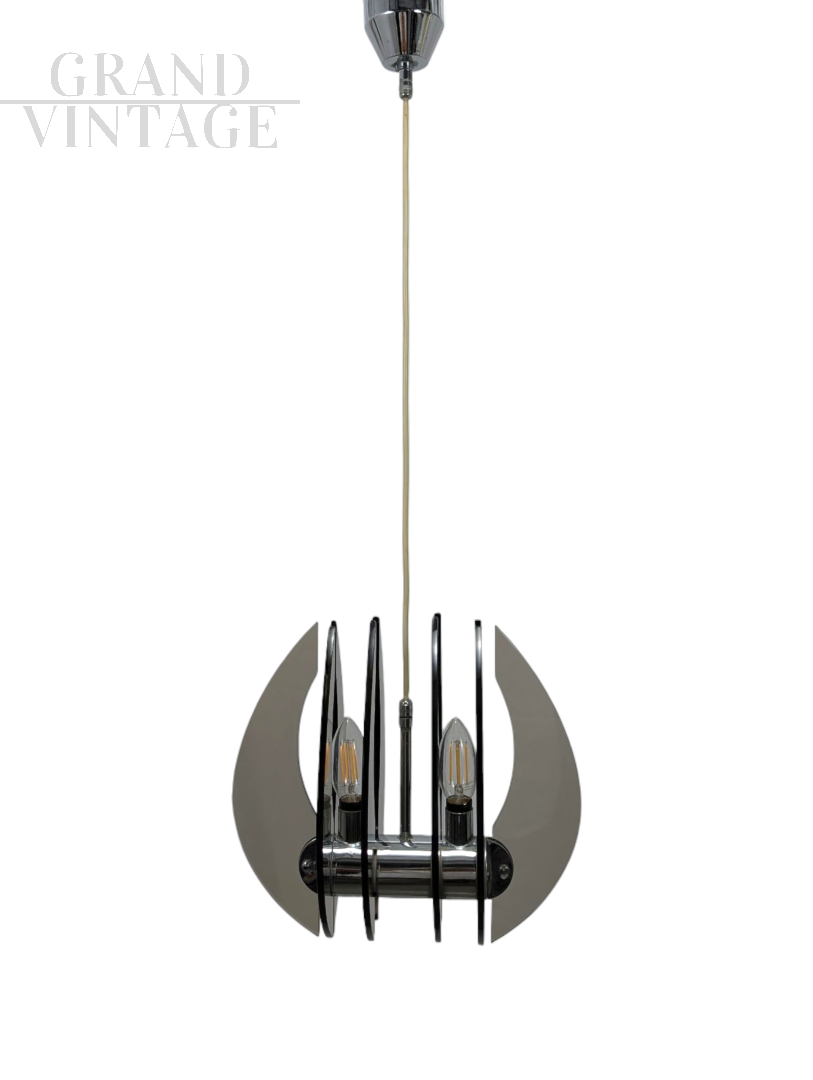Vintage smoked glass pendant light in space age style, in excellent condition, electrical system tested and working. Inputs for E14 bulbs.