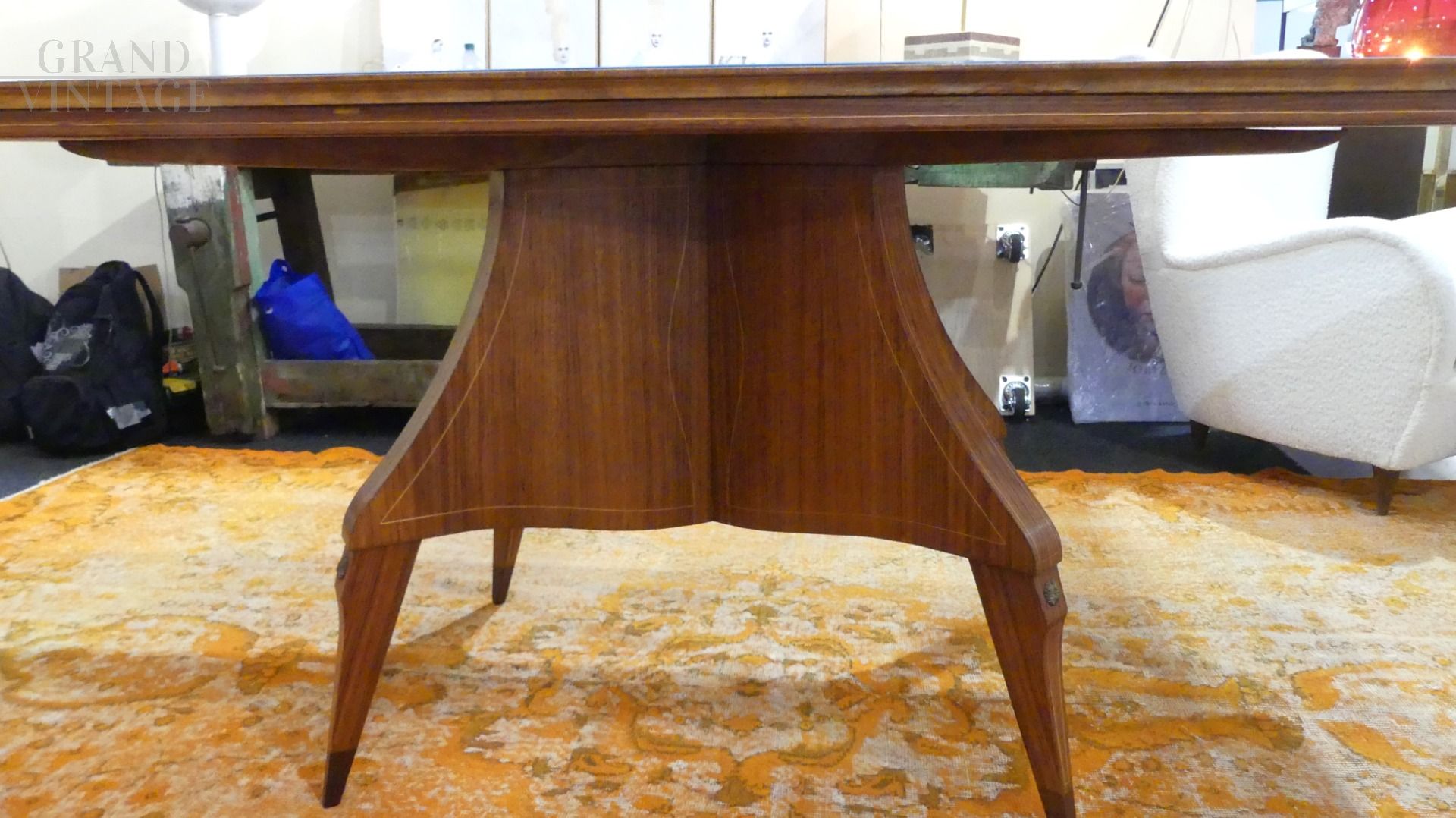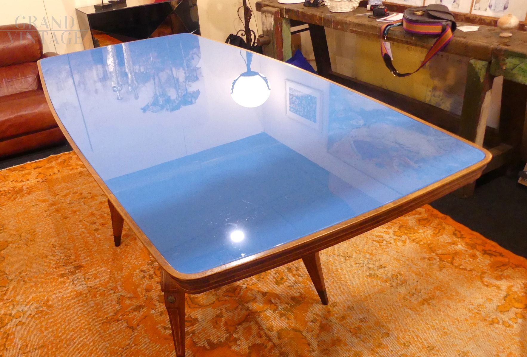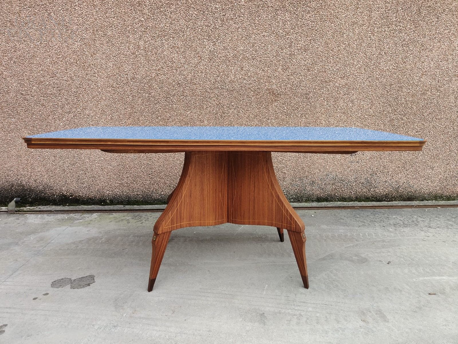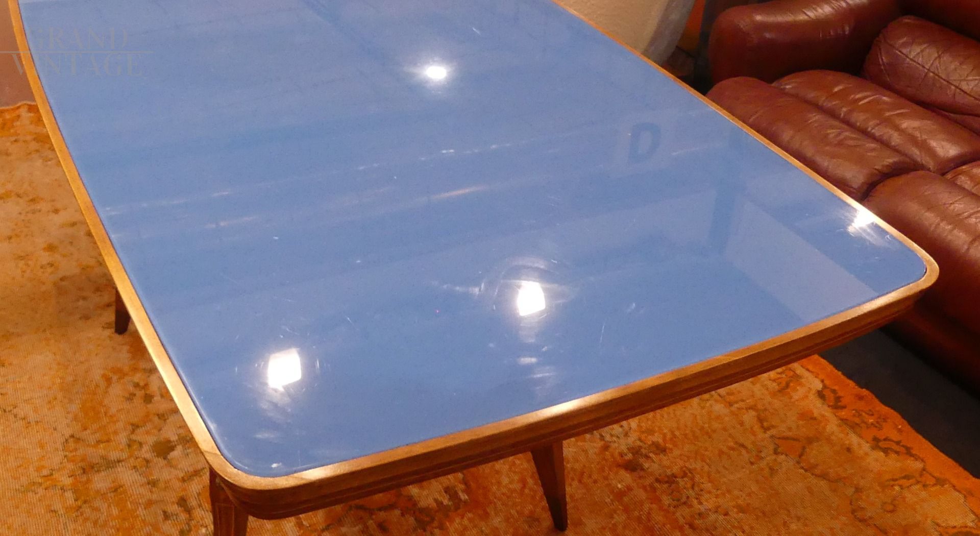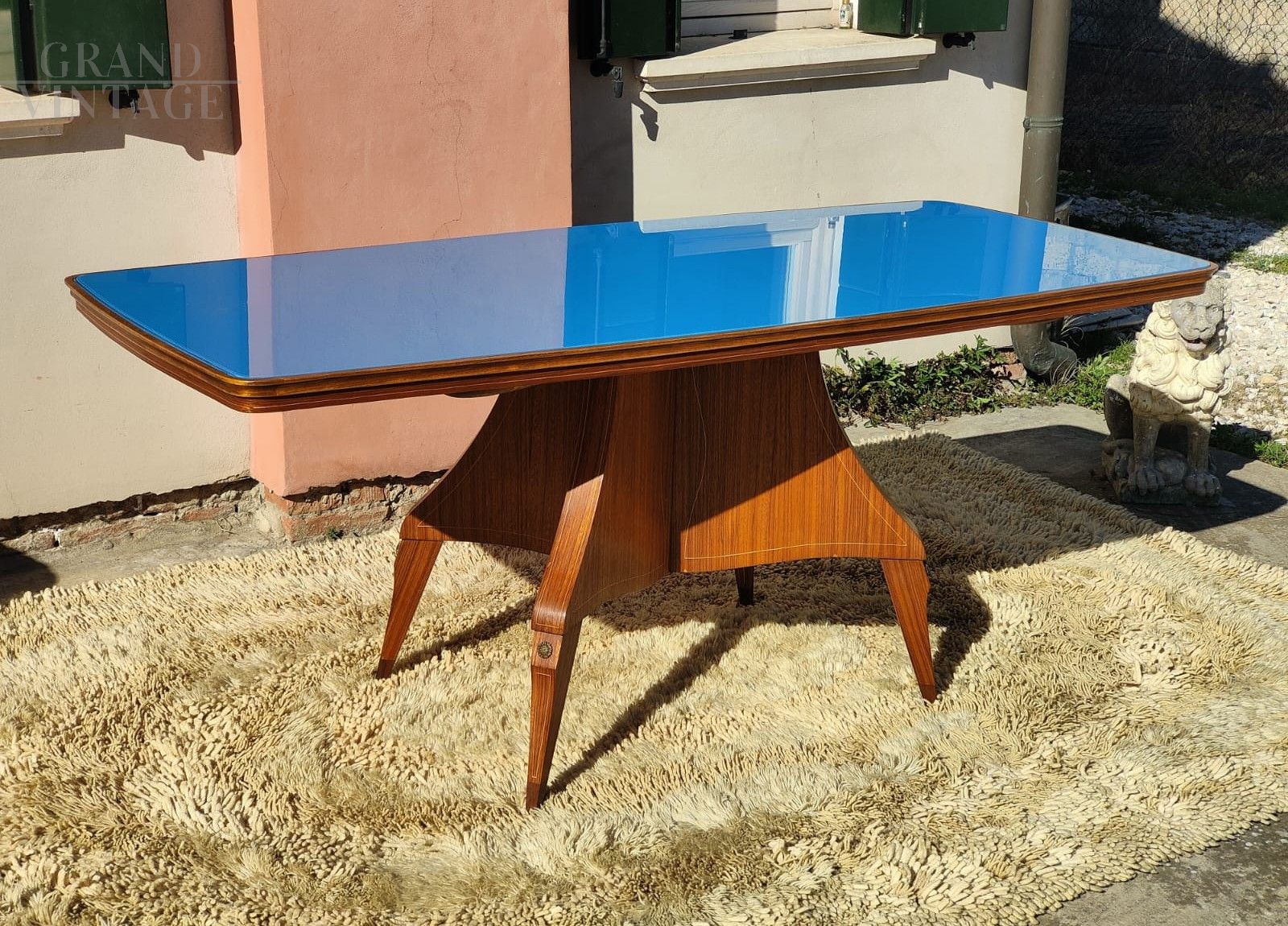 Italian mid-century table from the 50s in rosewood with light blue glass top and large inlaid central leg enriched with brass tiles to be polished according to one's taste. In excellent condition.