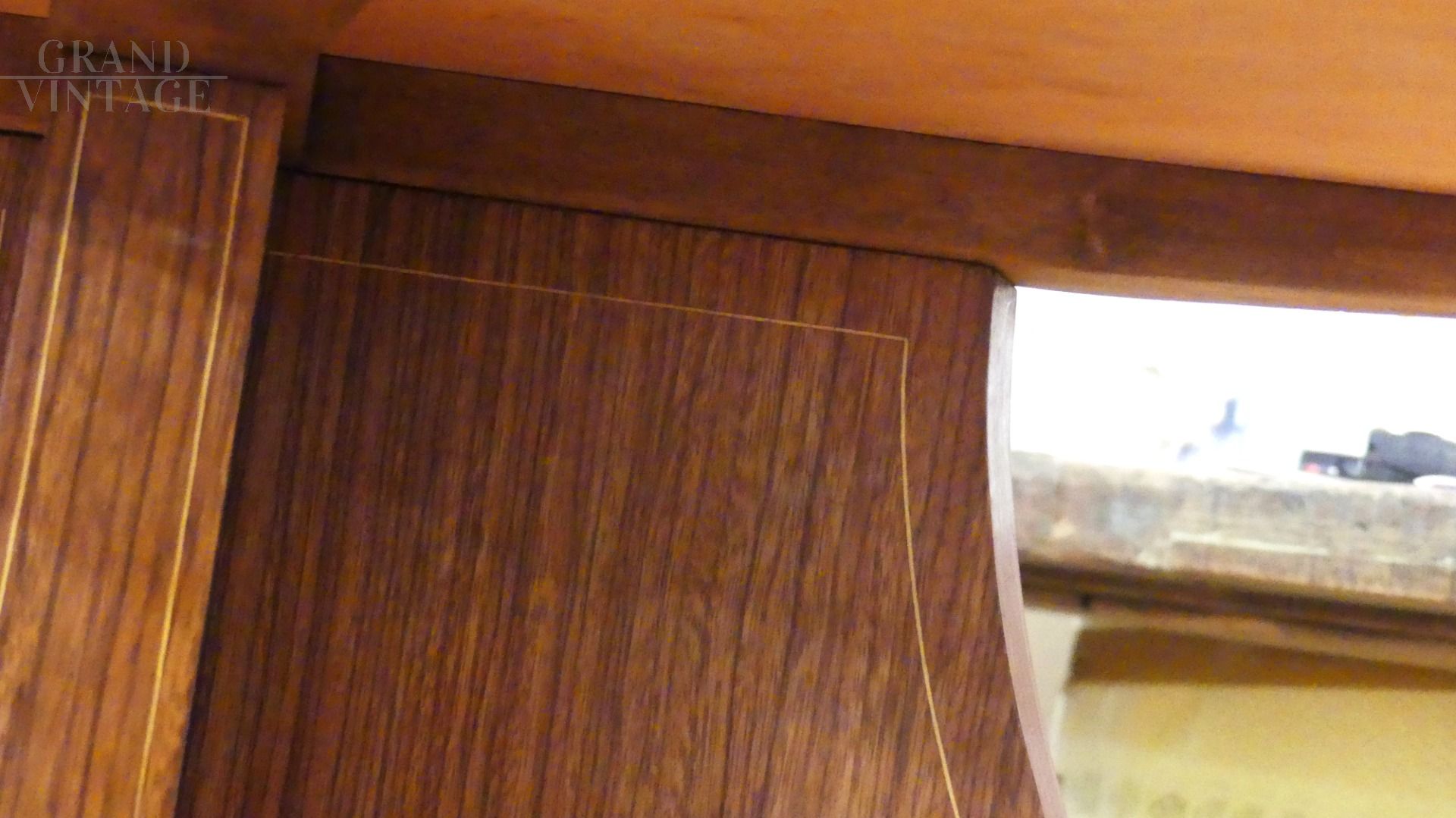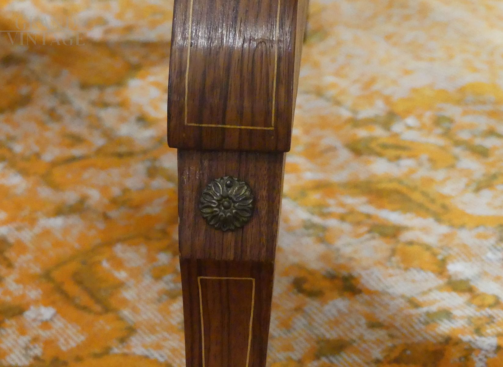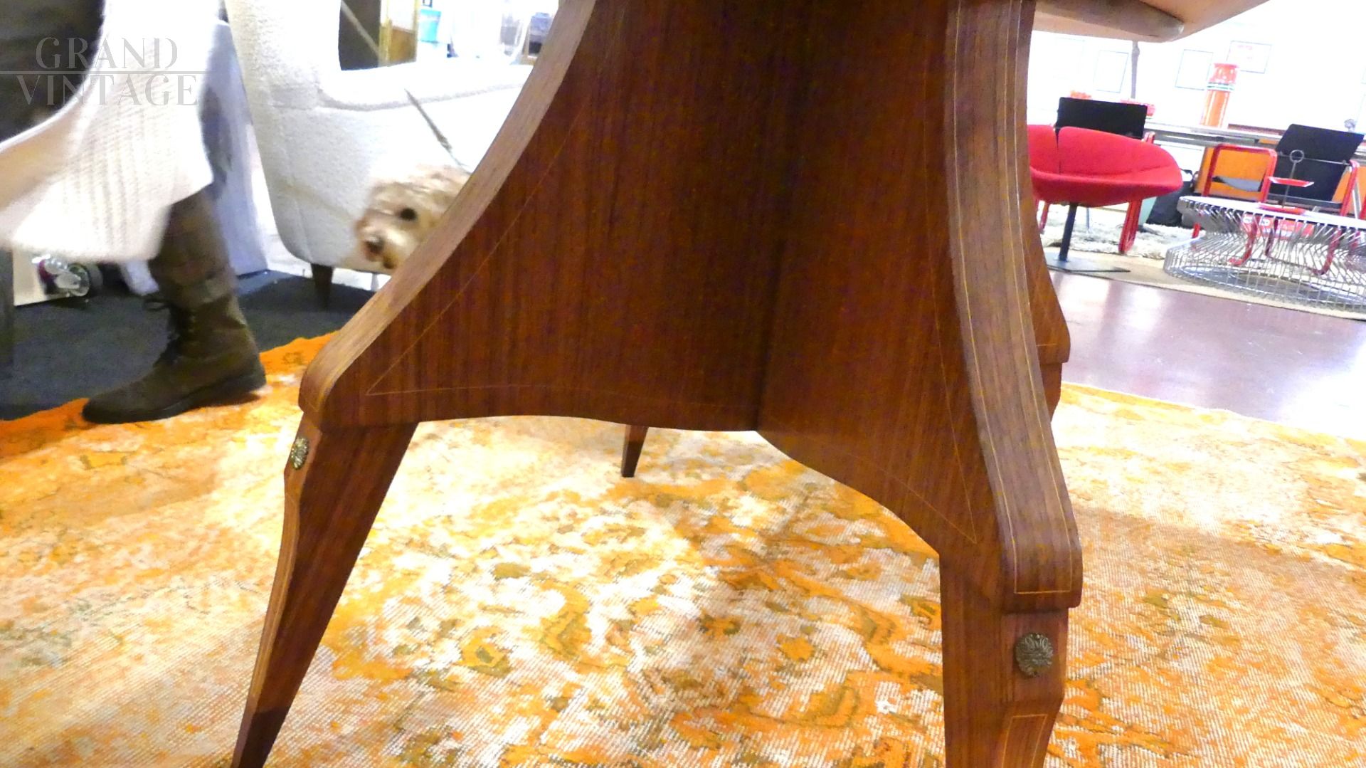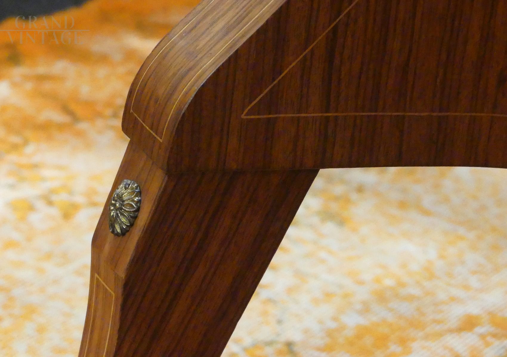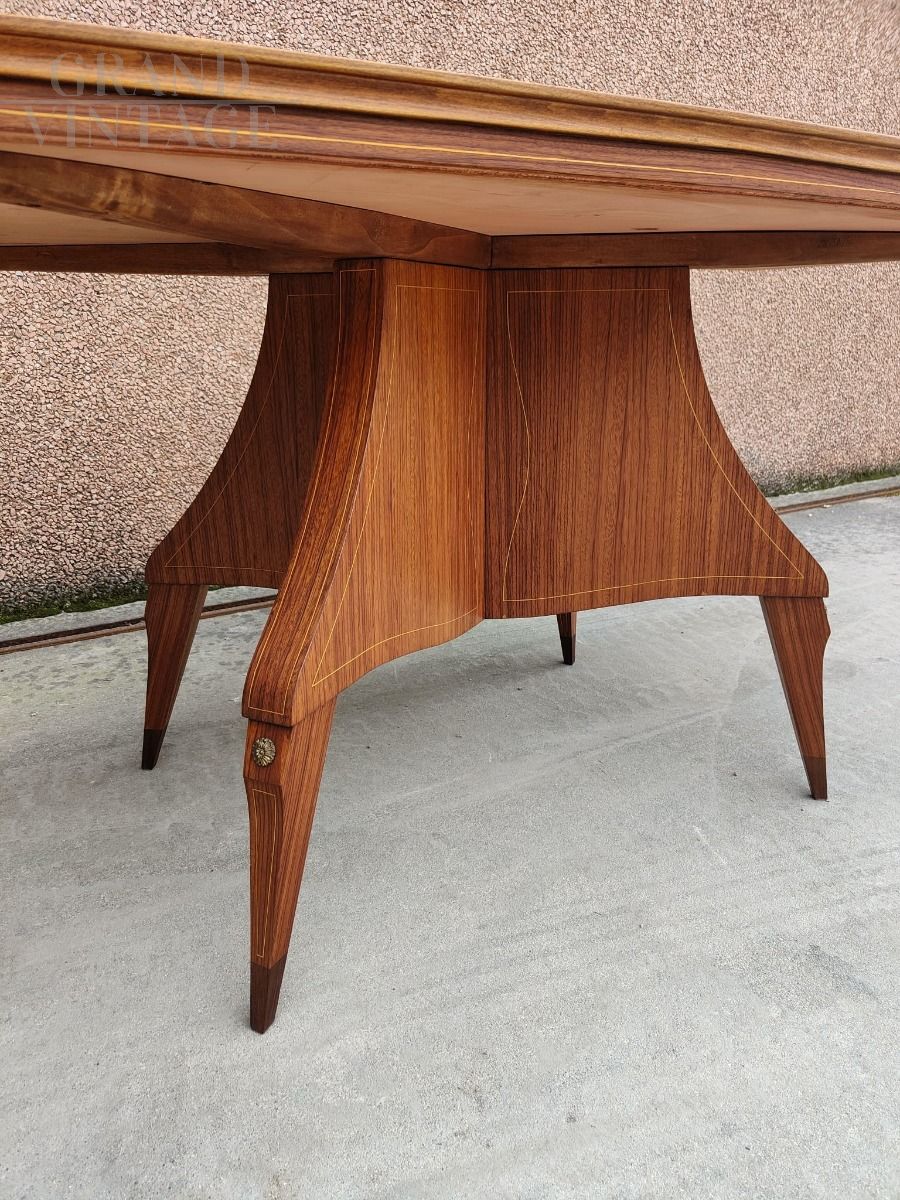 Italian mid-century table from the 50s in rosewood with light blue glass top and large inlaid central leg enriched with brass tiles to be polished according to one's taste. In excellent condition.
