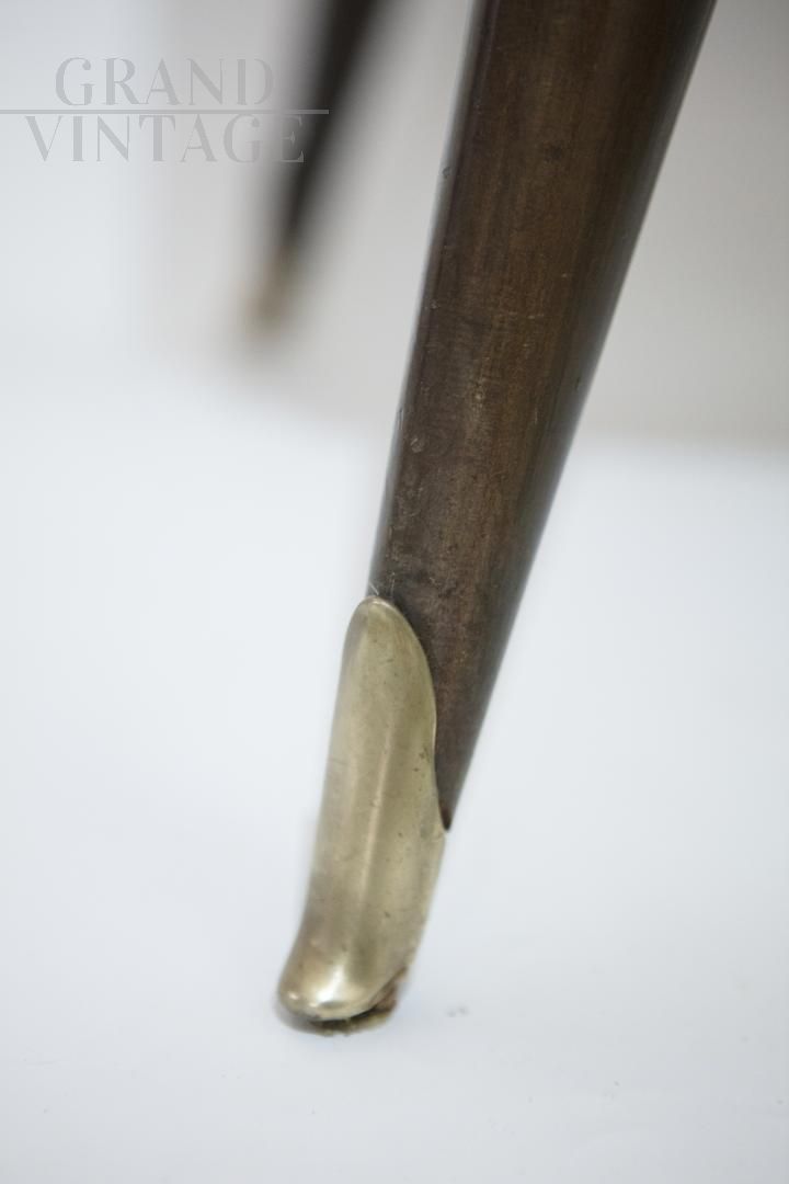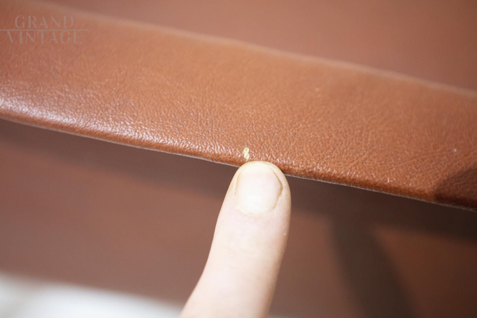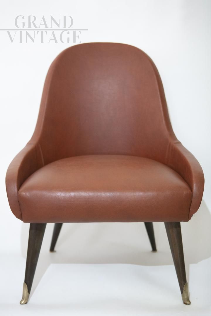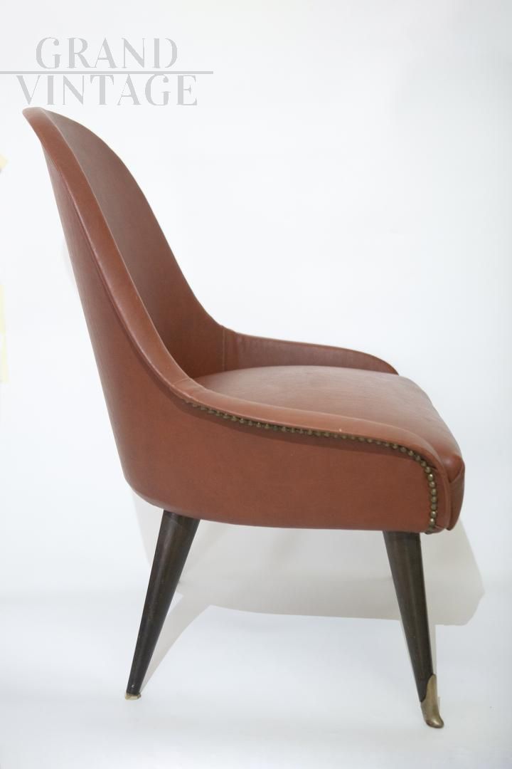 Pair of vintage 60s armchairs in brick brown skai faux leather with wooden legs and brass feet. With a characteristic design, the armchairs are in excellent condition both in the seat and in the structure, they do not show breakages but normal signs of aging, highlighted in the photos.
