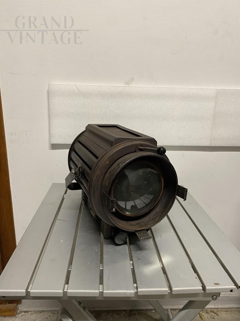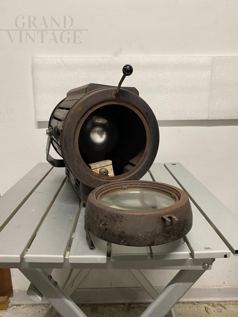 Vintage stage spotlight from the 60s, structurally intact and well preserved. The surface paint certainly does not hide the years of this splendid object by narrating the story it has lived. Equipped with an industrial socket, the light bulb is not present. It can therefore be cleaned and used as a design object or restored and used as a real light. Maybe you just need to put a suitable lamp in it to make it work since there are no circuits inside that could compromise its operation, that needs to be overhauled. The outer diameter of the lighthouse is about 20cm, depth about 35cm. Considering the base and the support, the total lateral space is about 25 cm.