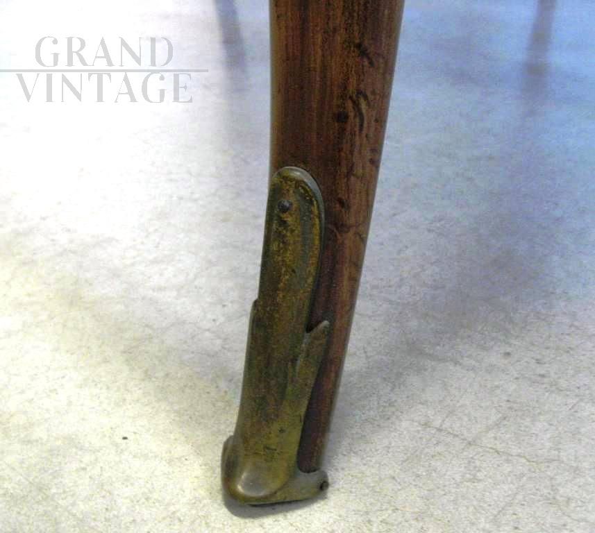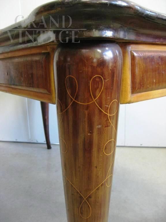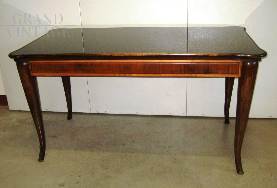 Vintage Italian modern 1960s rectangular table with black glass top, inlaid legs and small brass friezes on the foot. In excellent condition, in patina, it does not need restoration, it has small natural signs of wear on the paint.