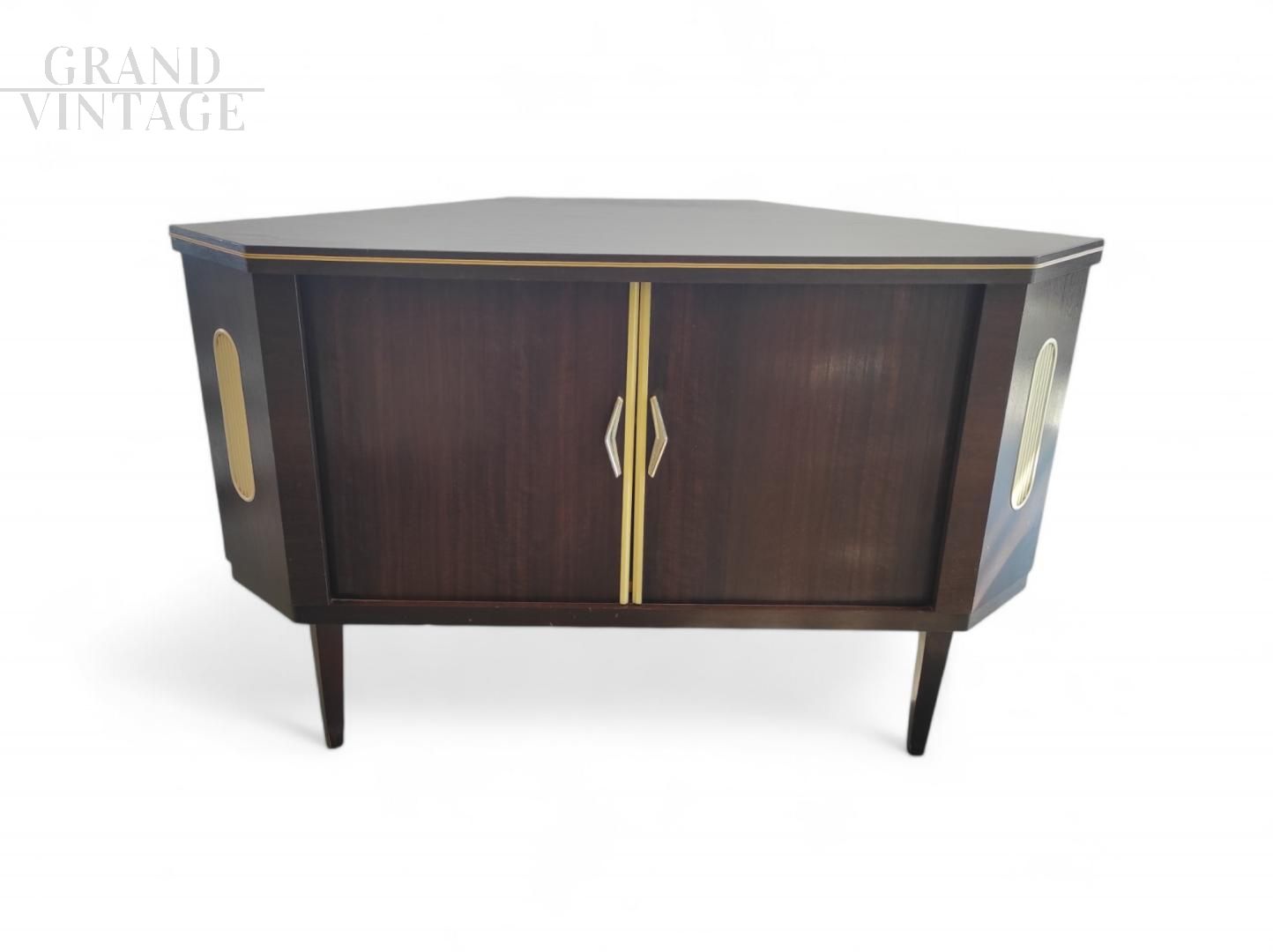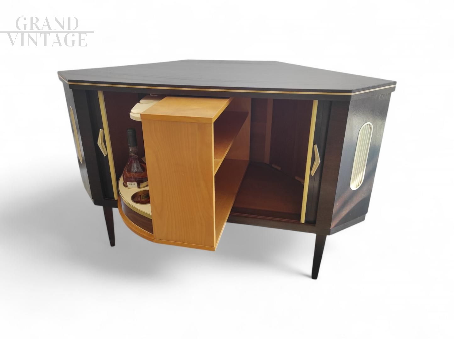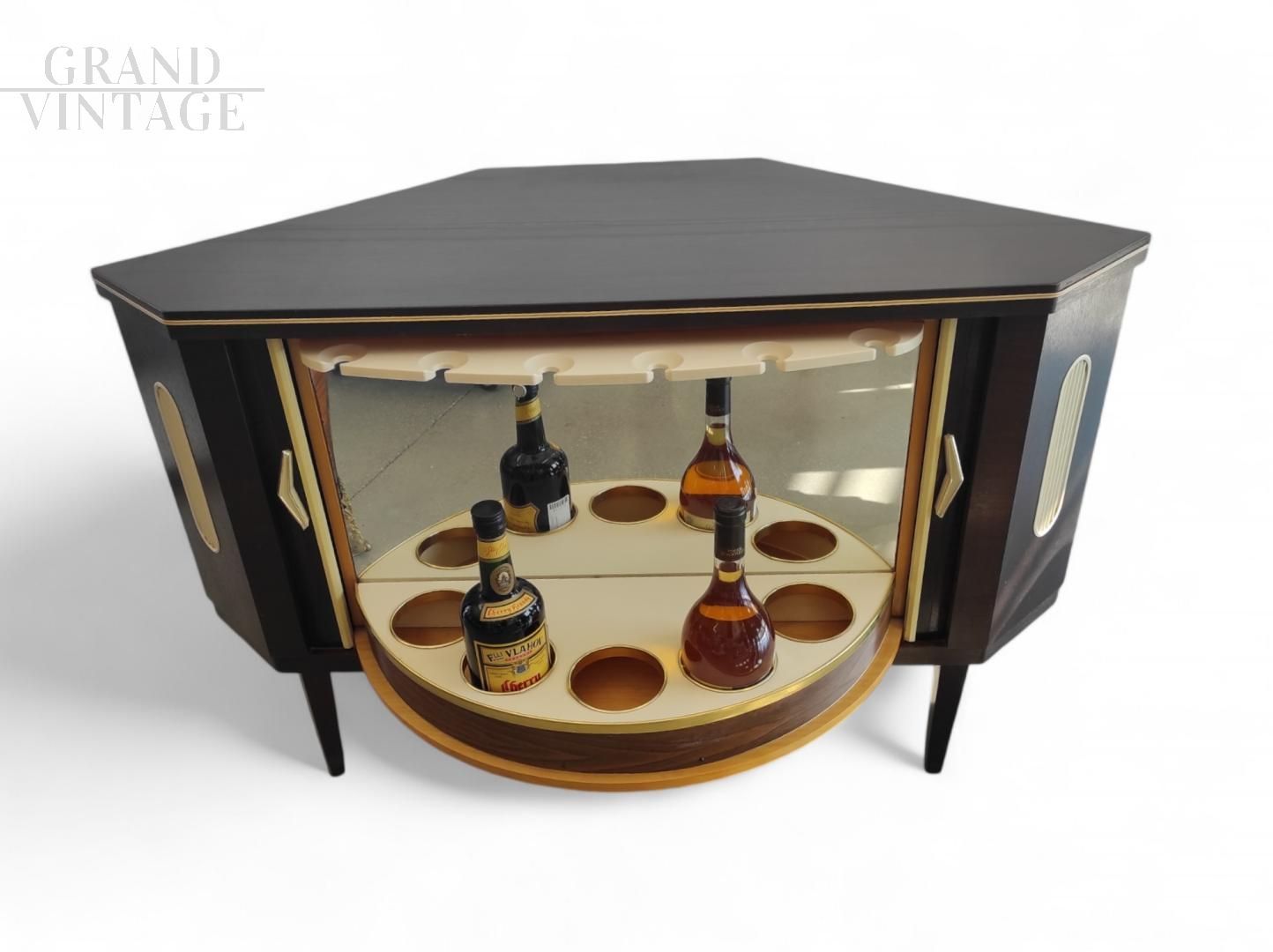 Vintage corner bar cabinet from the 70s in dark wood. The cabinet opens by sliding the two doors to the right and left. By rotating the internal part, a bottle container with a mirrored bottom comes out. Excellent general condition, there are some marks on the surface (see photo).