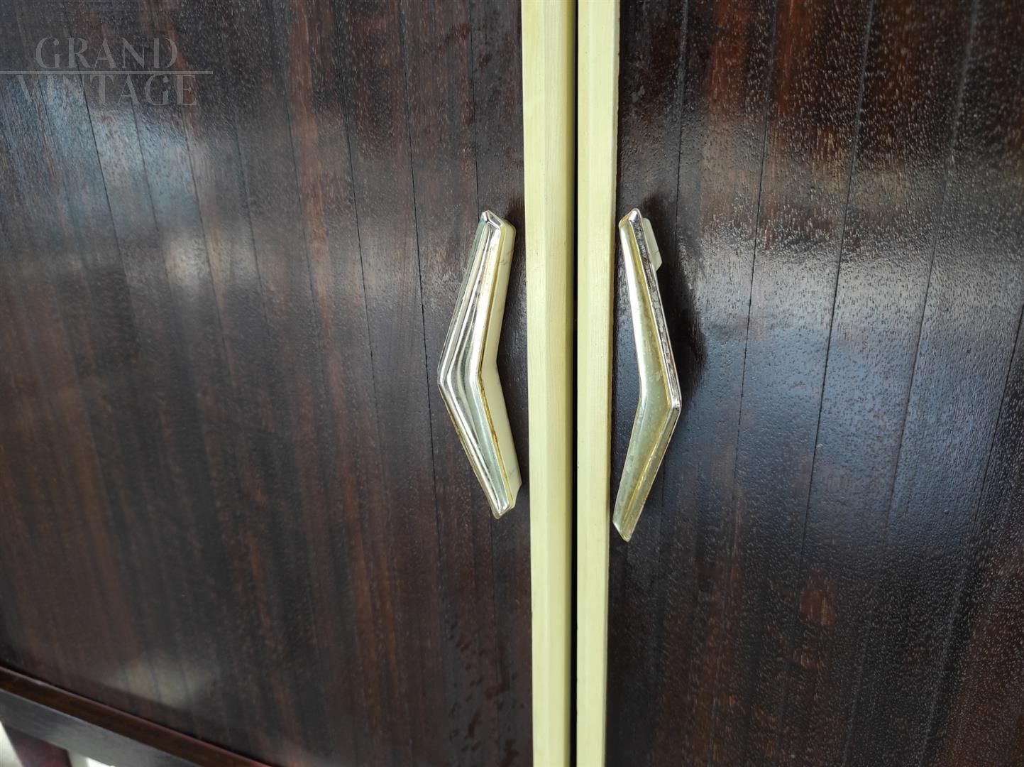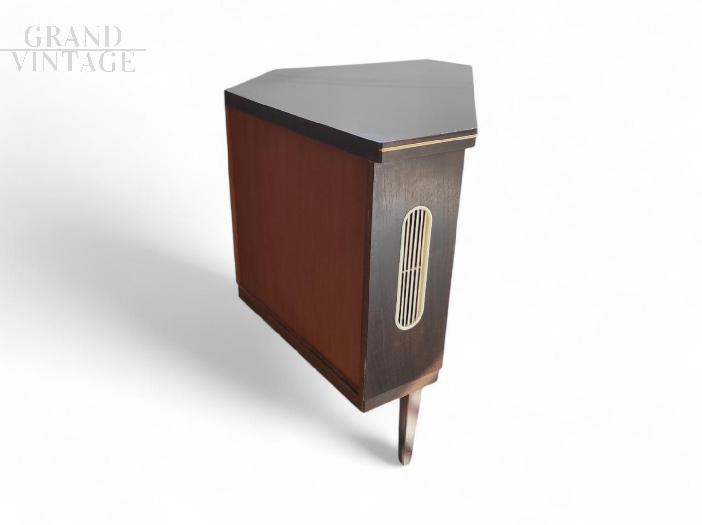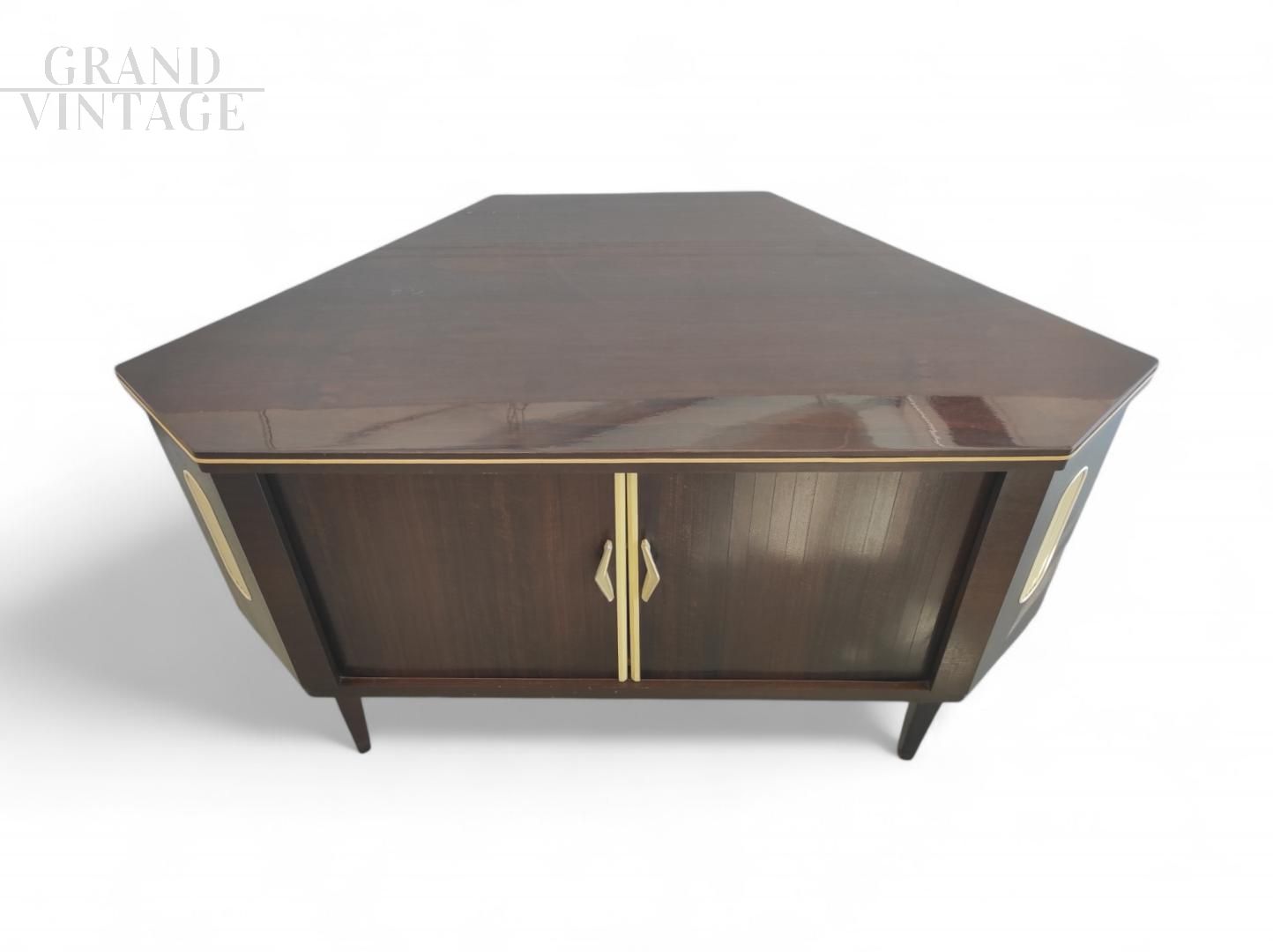 Vintage corner bar cabinet from the 70s in dark wood. The cabinet opens by sliding the two doors to the right and left. By rotating the internal part, a bottle container with a mirrored bottom comes out. Excellent general condition, there are some marks on the surface (see photo).