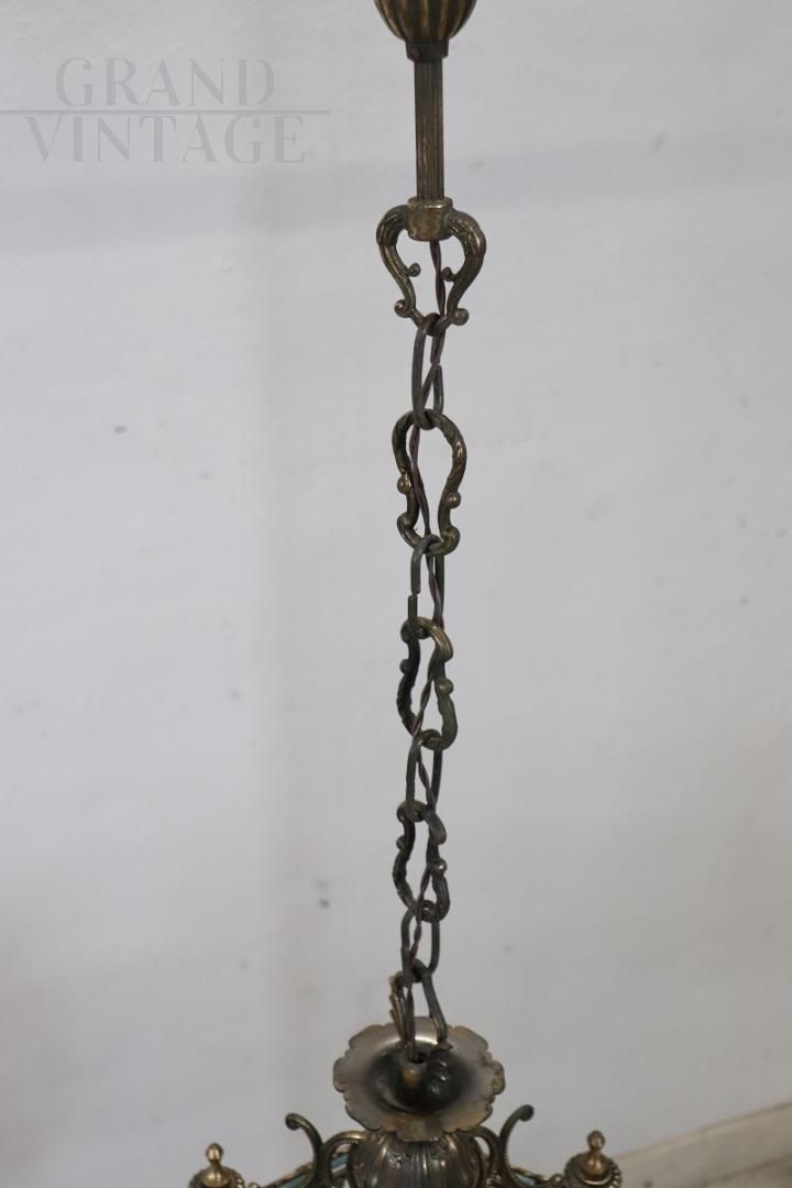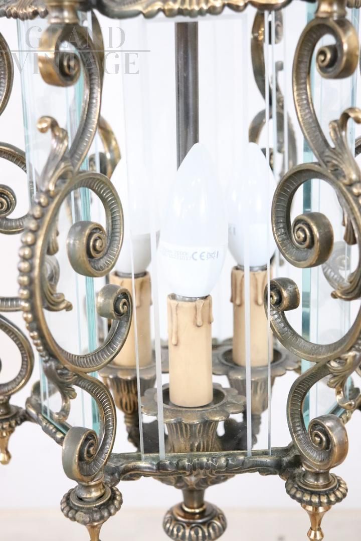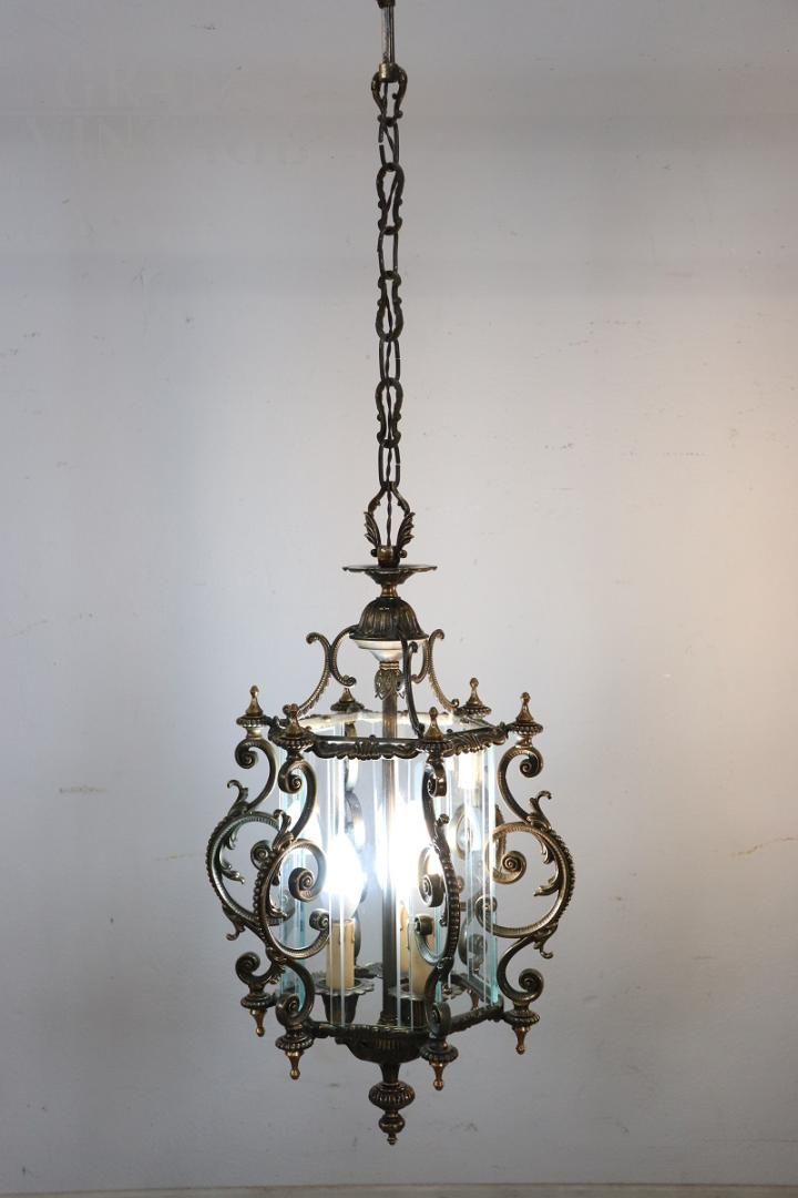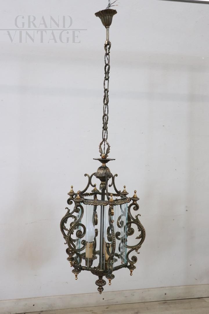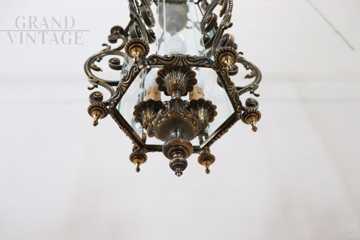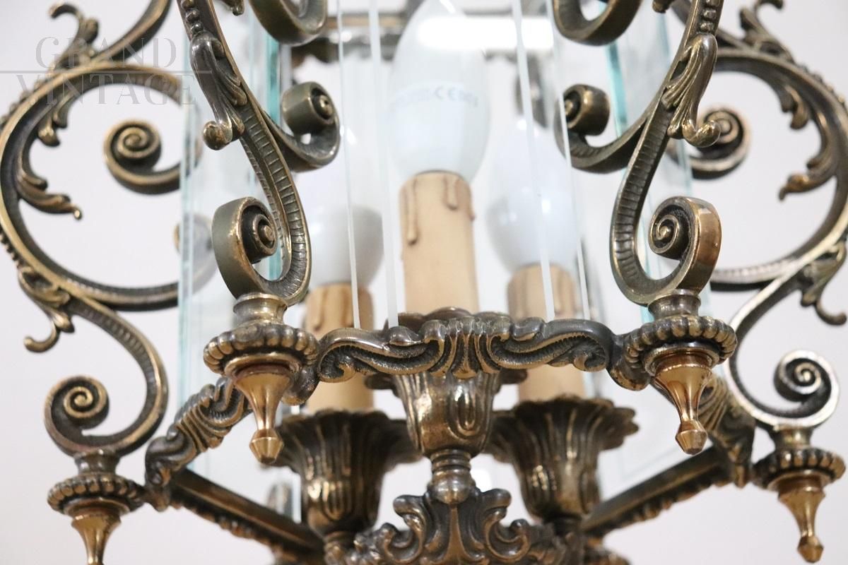 80s lantern chandelier in antique classic style with three internal bulbs. Made of glass and bronze with finely chiseled decorations. The bronze has acquired a beautiful patina. This lantern is beautiful to admire both on and off, the light filters through the transparent glass, also illuminating the beautiful bronze. Perfect for illuminating a corridor, an entrance, a stairwell or even small rooms. You can add or remove links to the chain. Price negotiable.