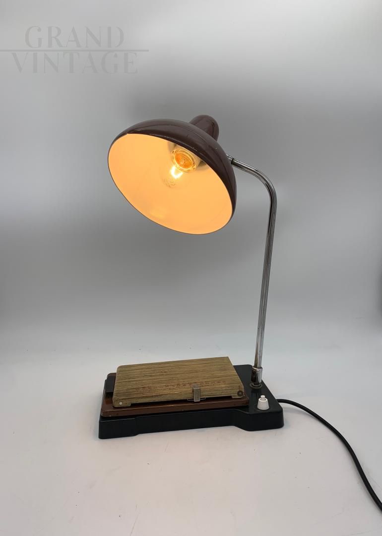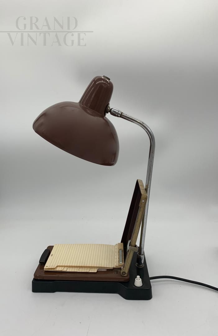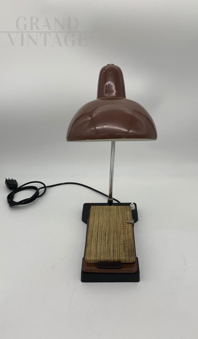 Fantastic and rare vintage adjustable desk lamp with built-in organizer, Italy 1970s, in good condition, with newly redone electrical system with E14 type bulb connection, working, it shows the classic signs of aging. The lamp has a characteristic plastic base with a resealable compartment to hide an agenda, its original from the time. Original colors.