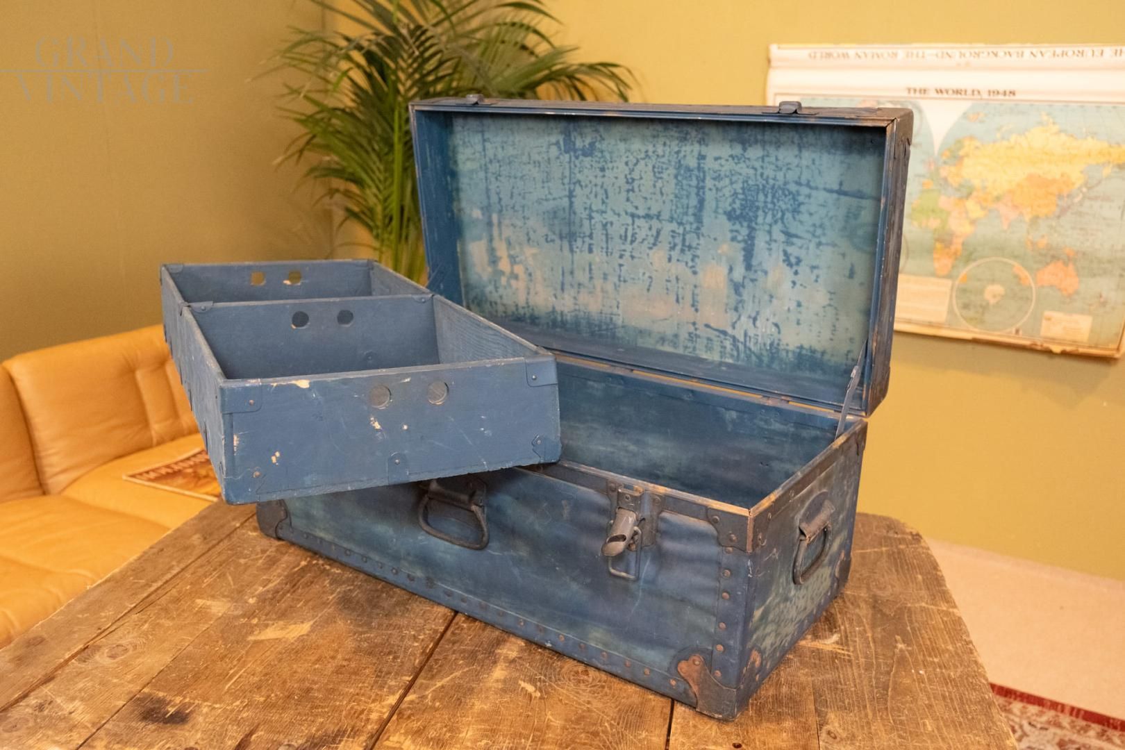 Vintage American military metal trunk with “US” branding and removable compartments inside, perfect for adding a vintage and military touch to your decor or for a practical and original use.