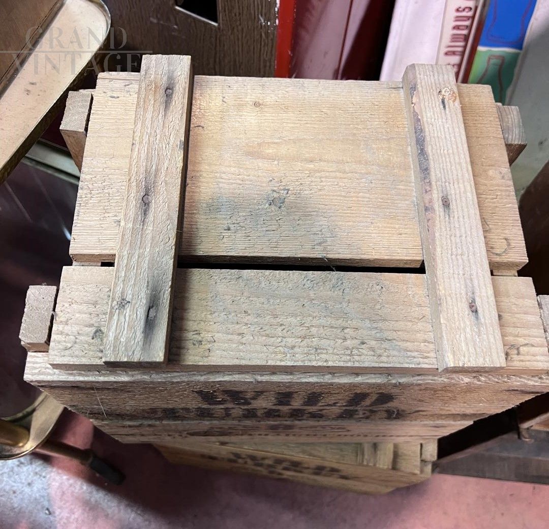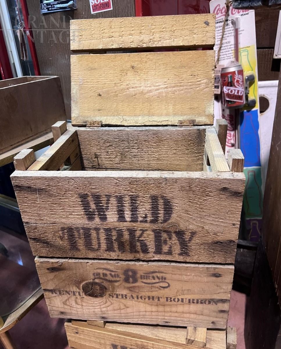 Vintage wooden crate that held bottles of Wild Turkey brand bourbon whiskey, complete with lid. Three crates available.