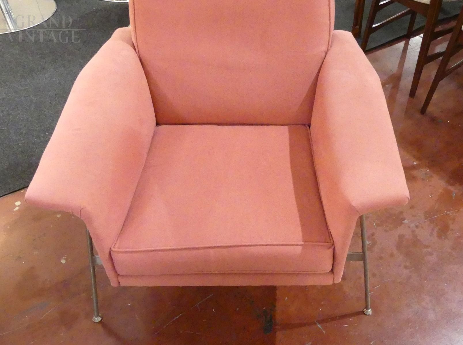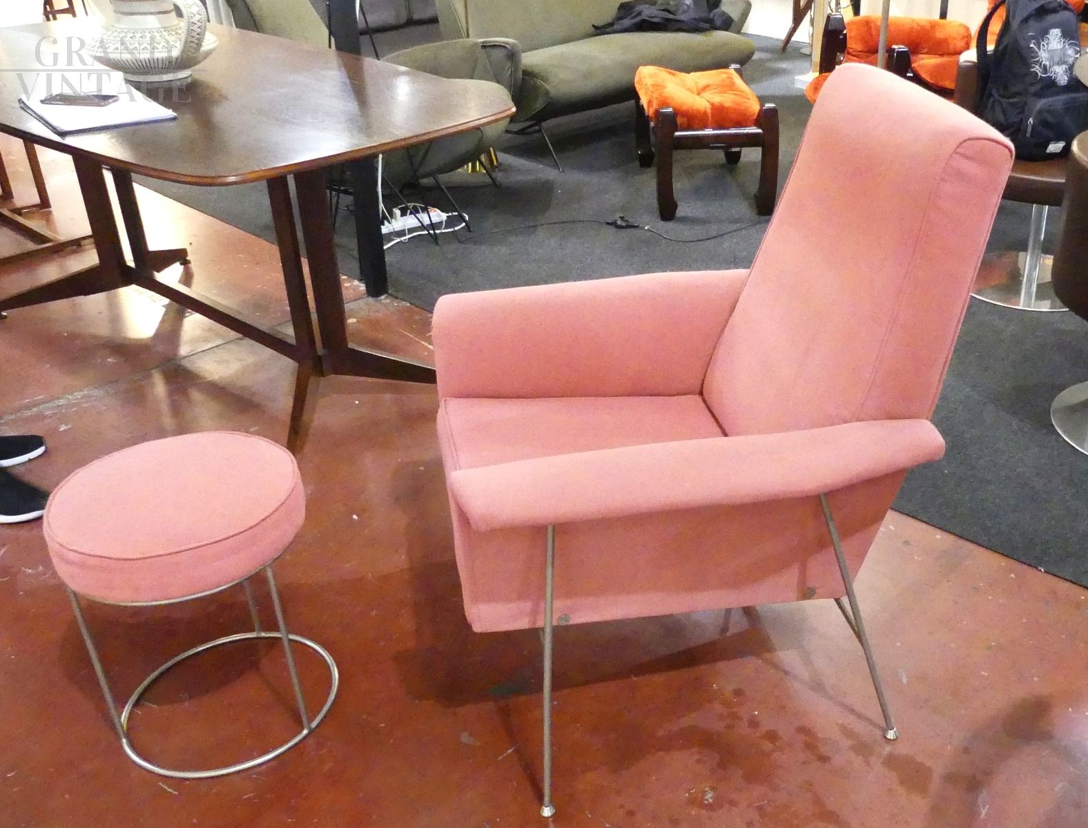 Vintage armchair in pink velvet with ottoman, on iron structure, 60s - 70s, reupholstered in the 90s, in excellent condition. Both the armchair and the ottoman can be dismantled to facilitate transport.