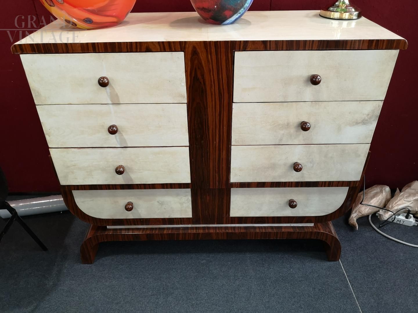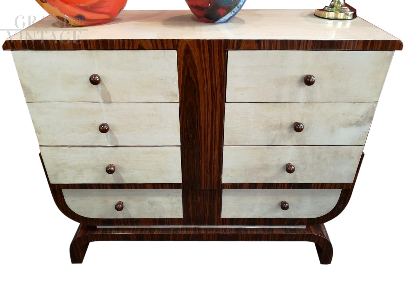 Vintage art deco chest of drawers in rosewood and ivory parchment