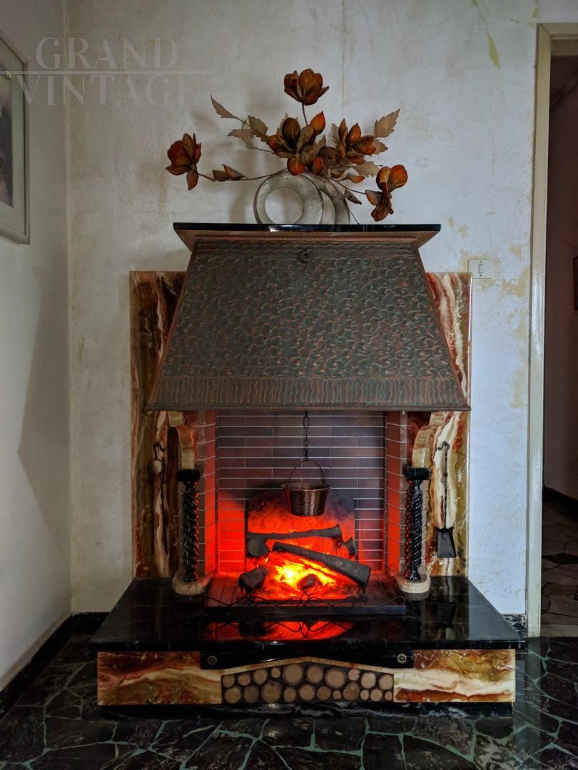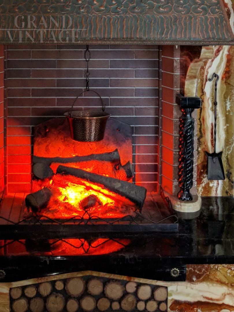 Vintage atmosphere bar cabinet in the shape of a fireplace, with lights in the glass cabinet and fake wooden logs with lights that simulate a lit fire. The surfaces are of faux marble.