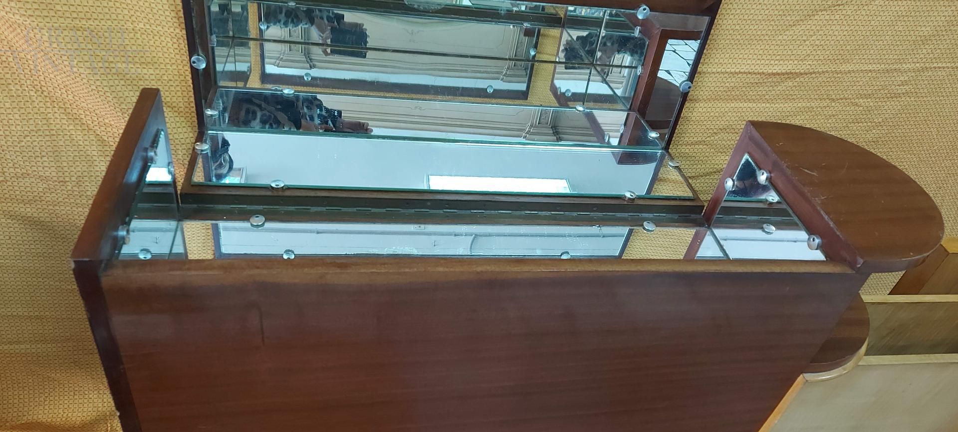 Beautiful vintage bar cabinet with counter and back to be placed on the sofa or on the wall, in maple and mahogany, 1950s, with mirrored interior and pull-out bottle holder on one side.