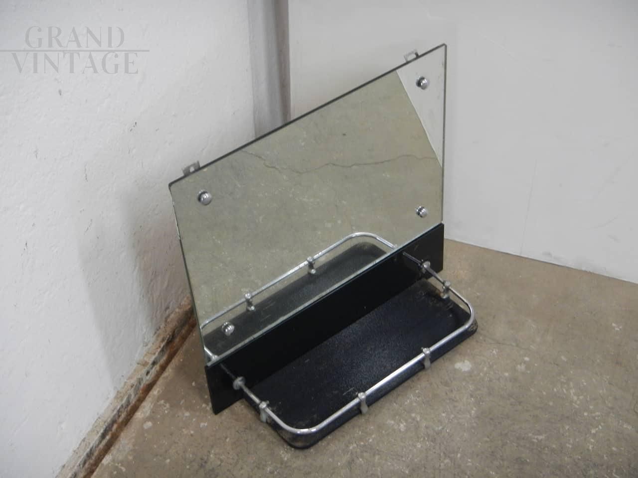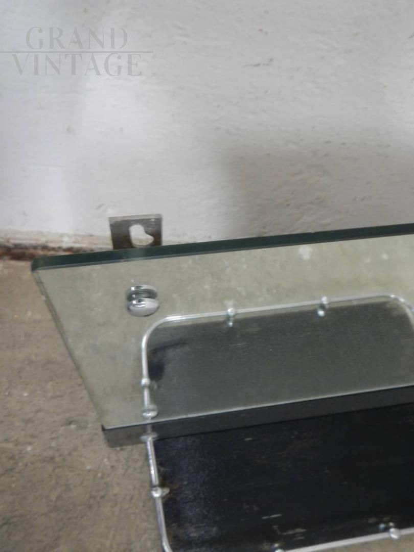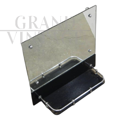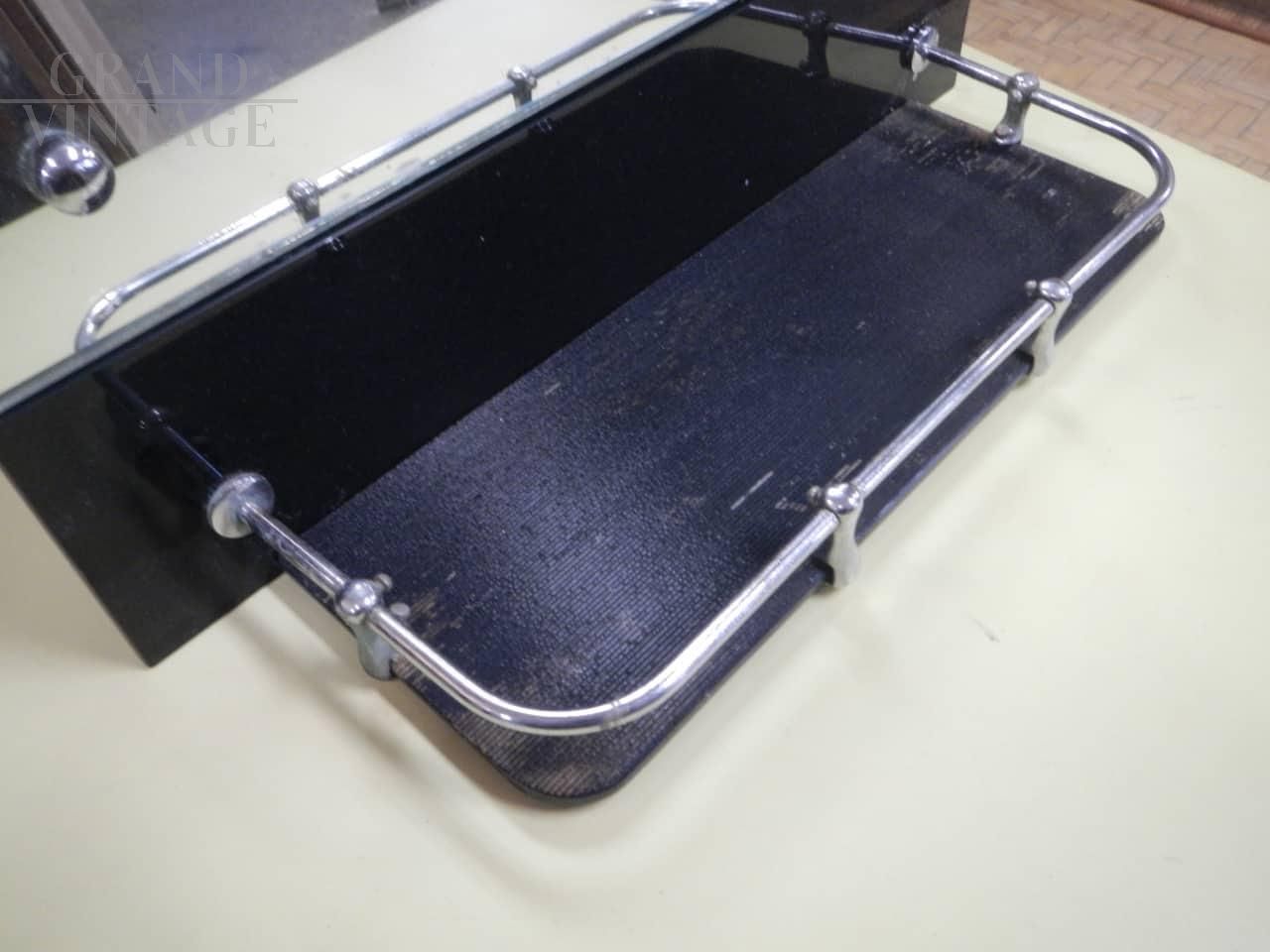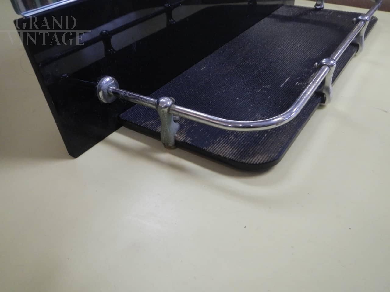 Vintage bathroom mirror with black colored glass shelf and chromed metal profiles. Complete with hooks for wall mounting.