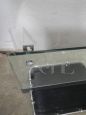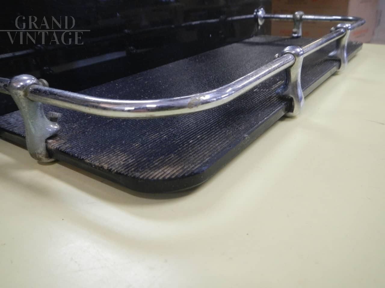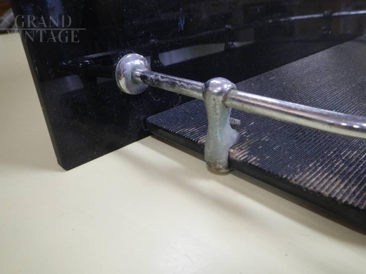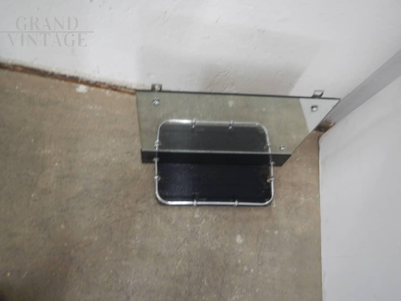 Vintage bathroom mirror with black colored glass shelf and chromed metal profiles. Complete with hooks for wall mounting.