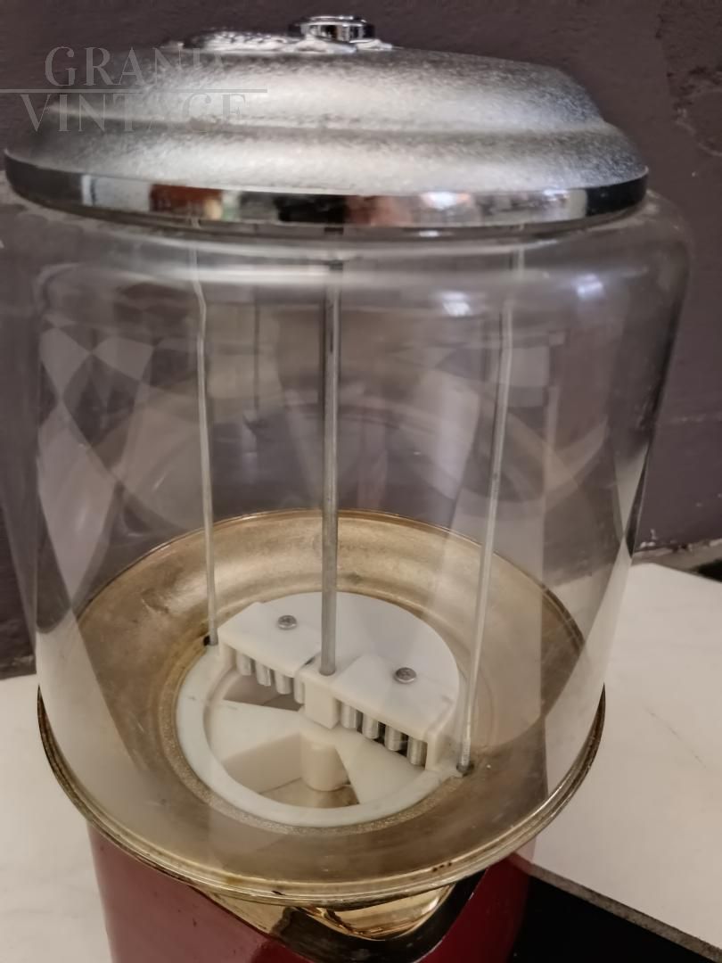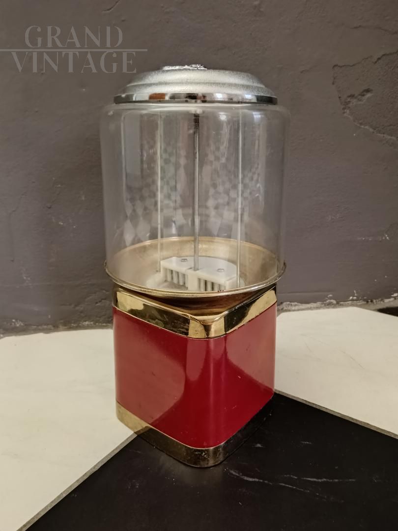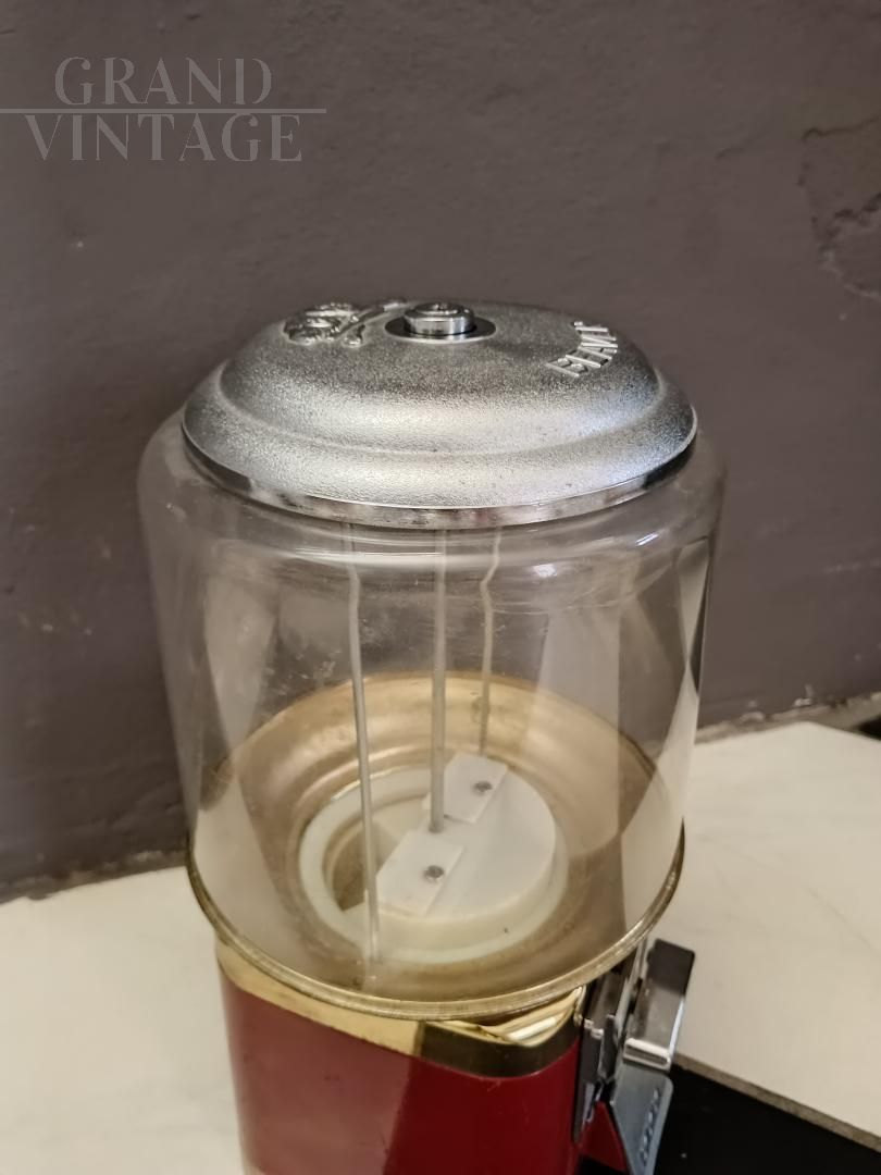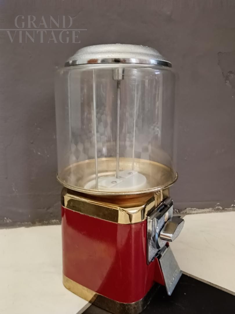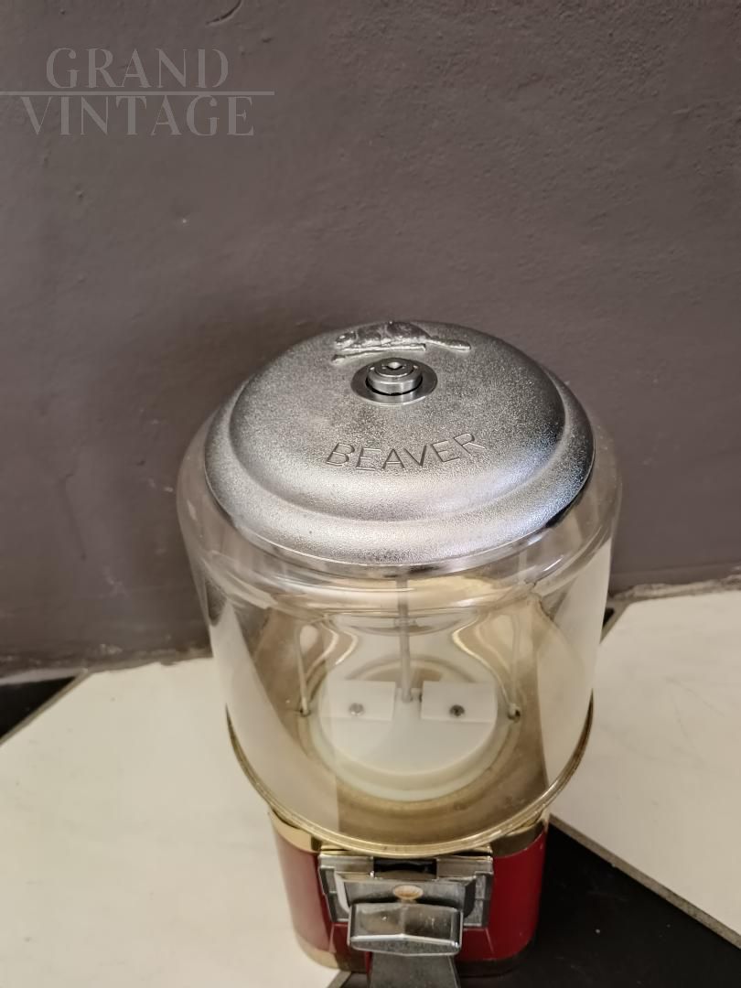 Beautiful vintage countertop candy dispenser from the Beaver brand in burgundy, with a gold-chromed edge detail instead of silver, fully functional with 50 euro cent coins and perfect for parties or clubs, or to add a fun touch to your home.