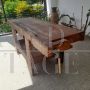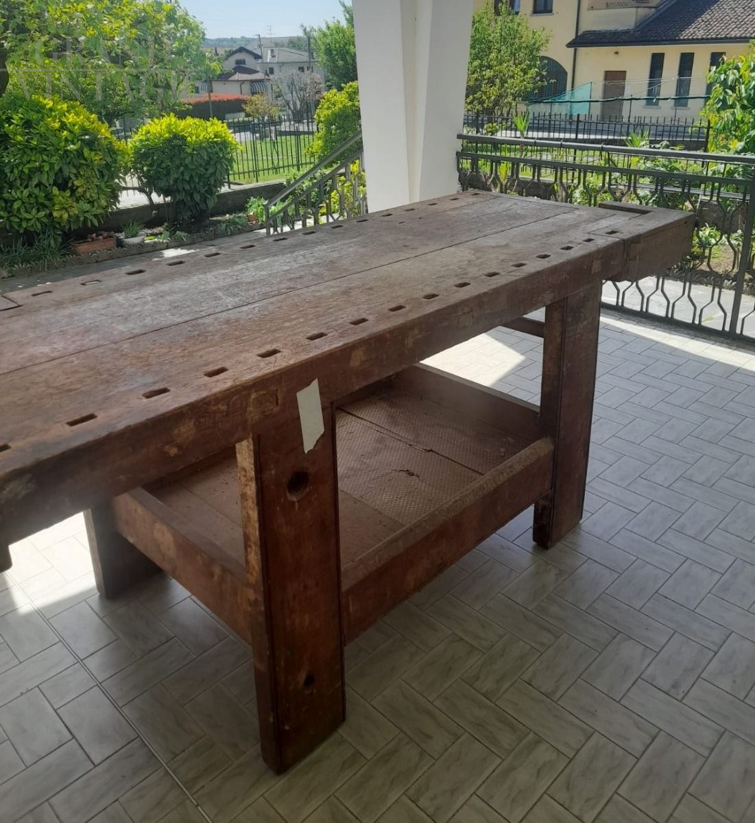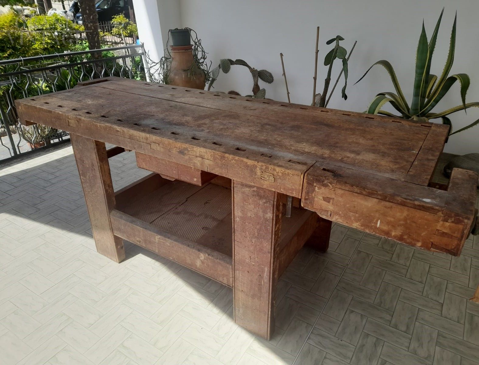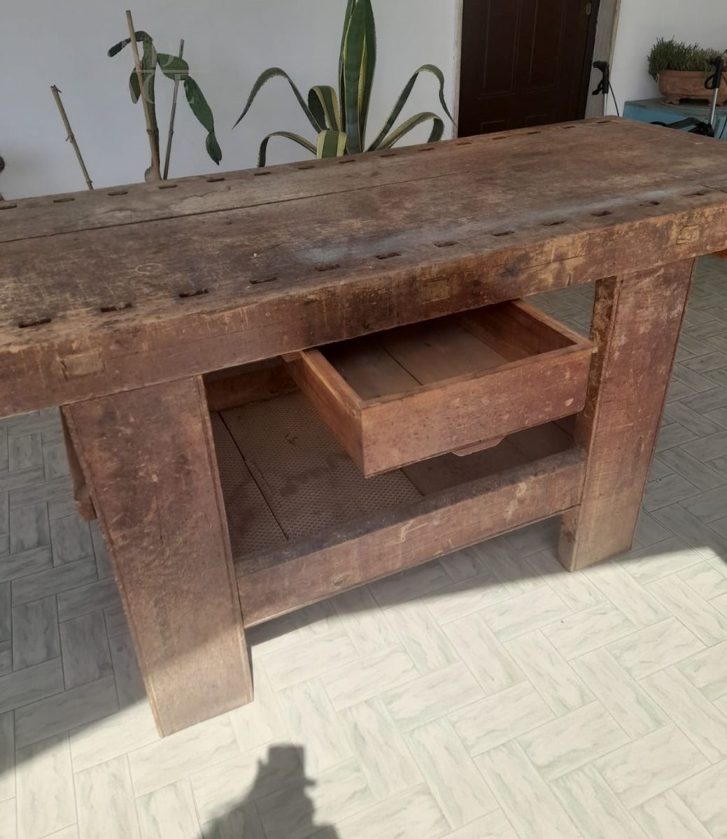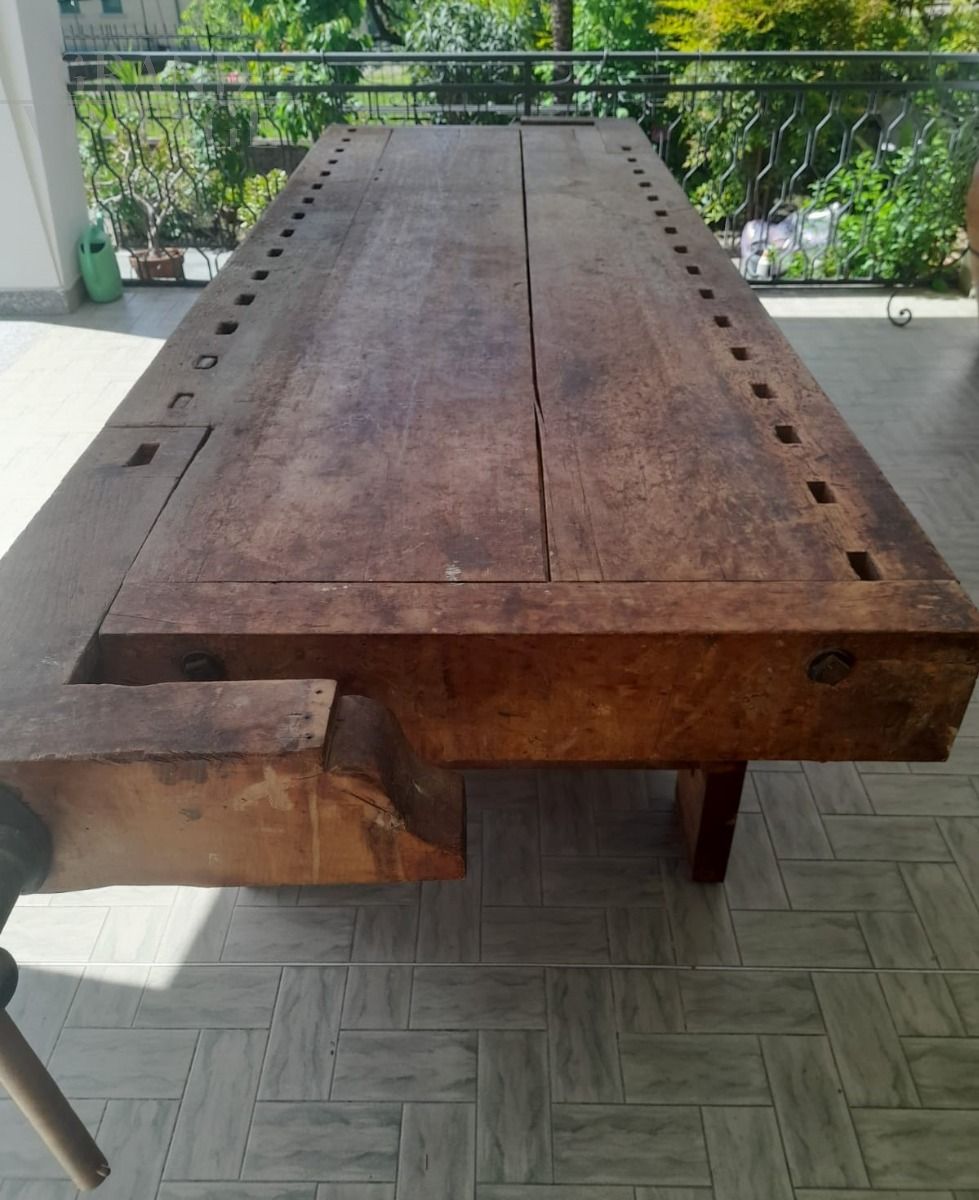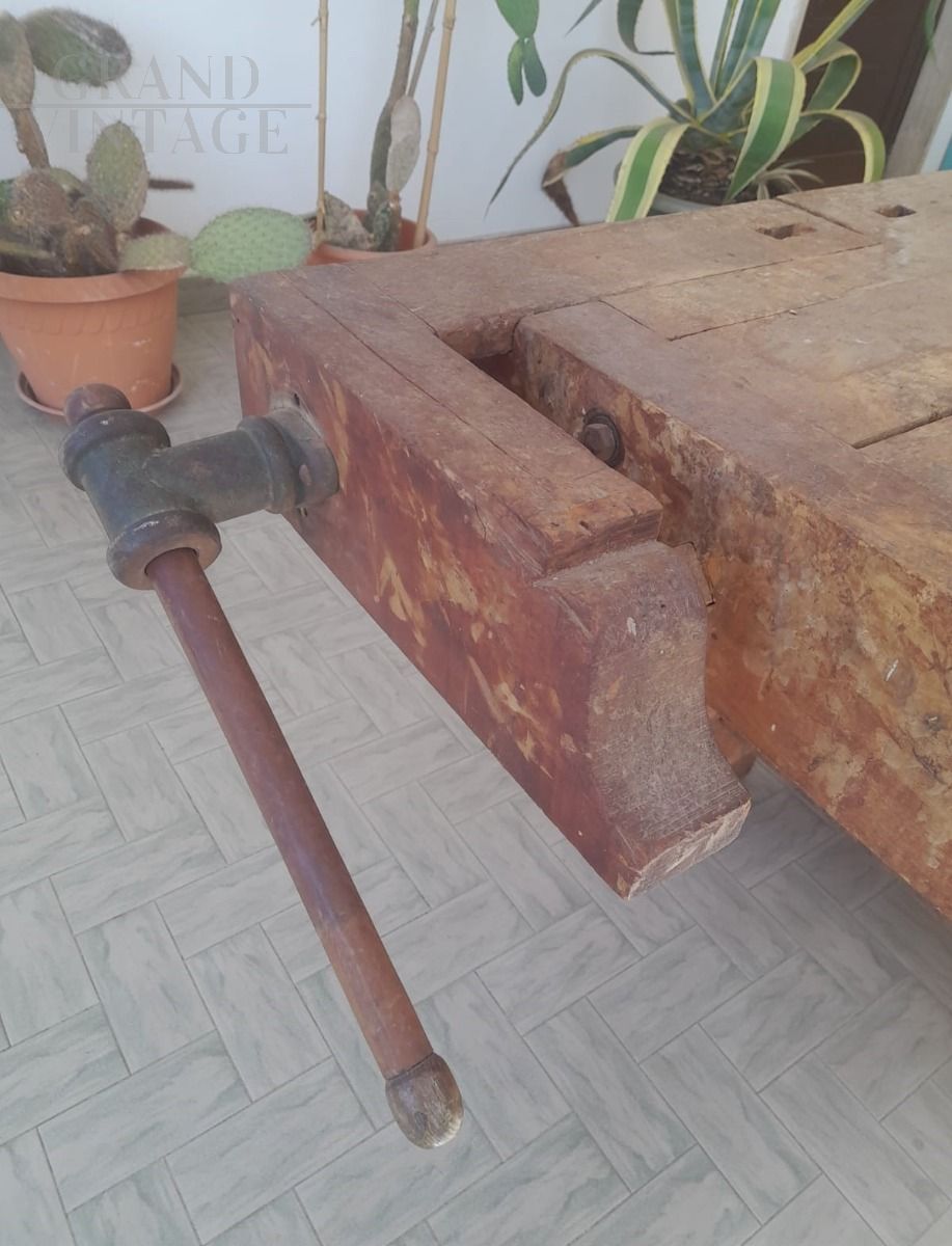 Banco da falegname vintage in faggio con doppia morsa e cassetto
