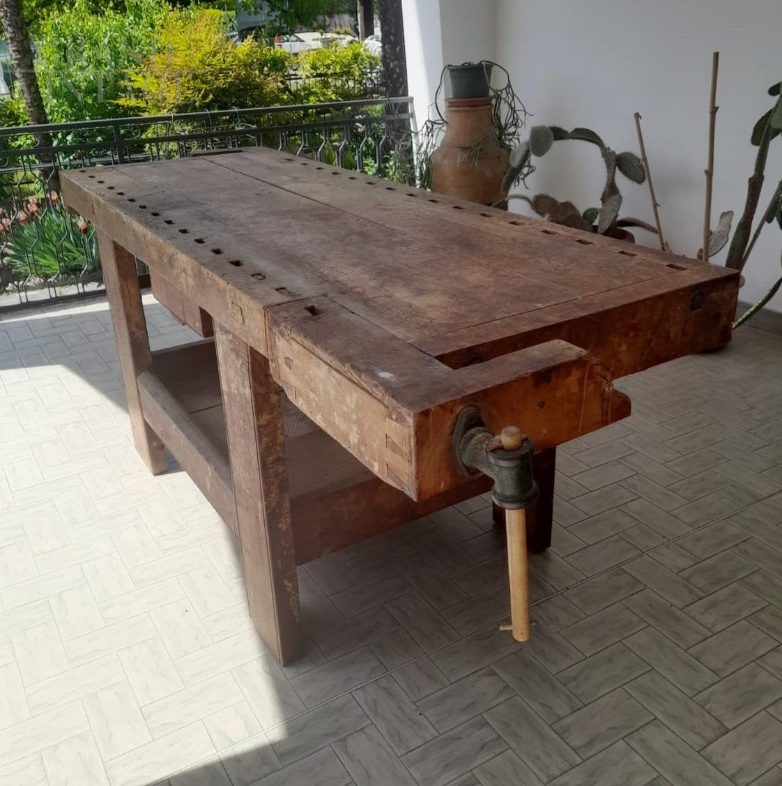Carpenter's workbench from the early 20th century in beech wood with double vice, central drawer and lower shelf in chestnut wood. The bench is in a beautiful original, unrestored condition.