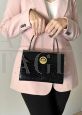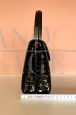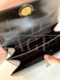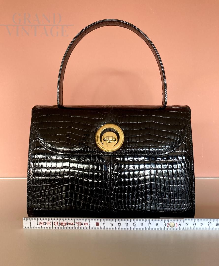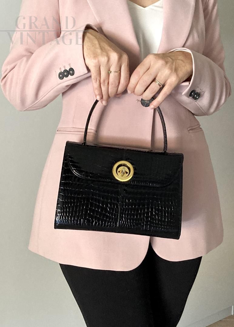 Vintage bag in genuine black crocodile leather with patent finish, made between the 1950s and 1960s, in Gucci style, with golden metal details. Interlocking closure. Black leather interior and two bellows pockets, one pocket with zip closure with removable mirror inside. Never worn and in perfect condition.