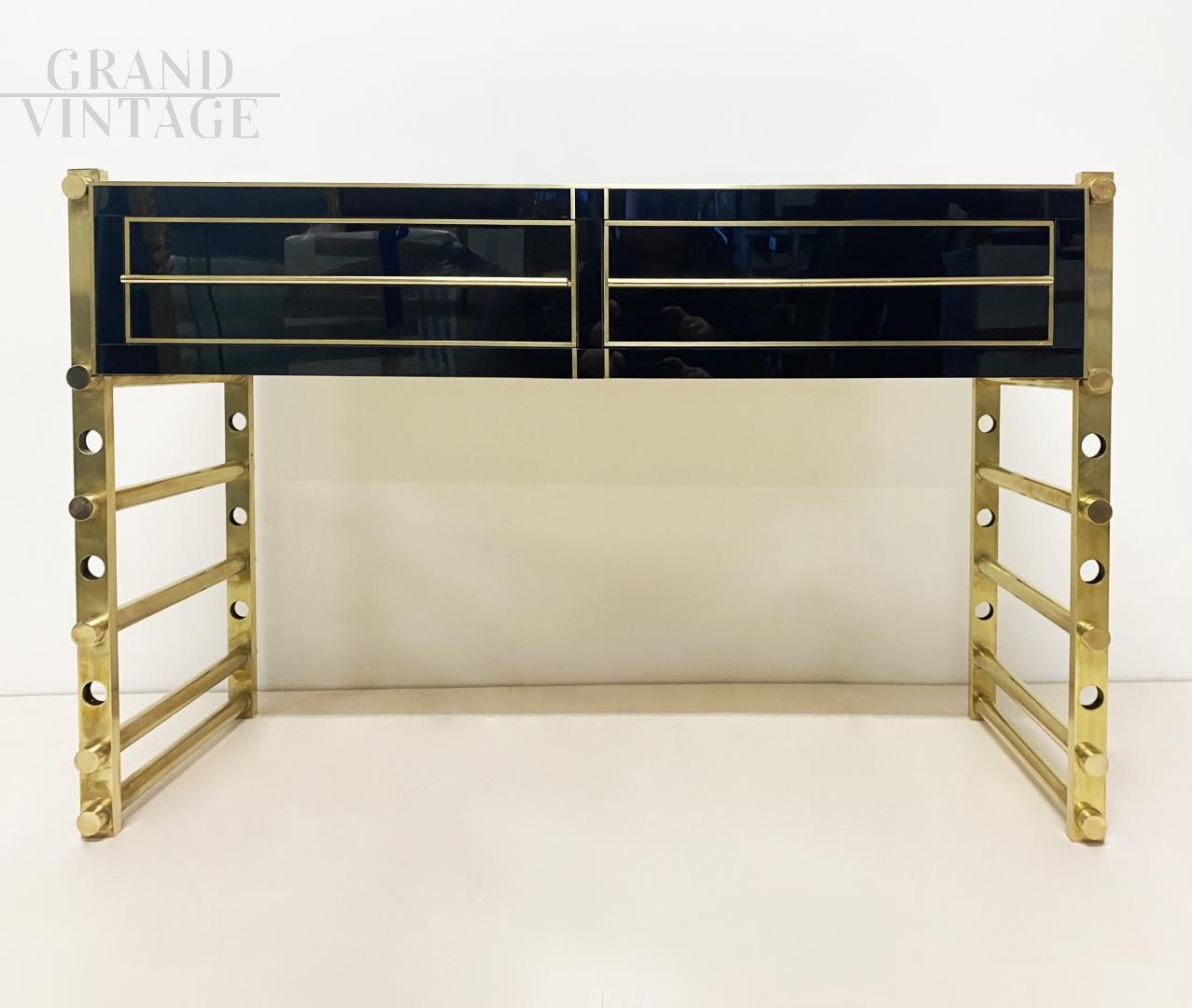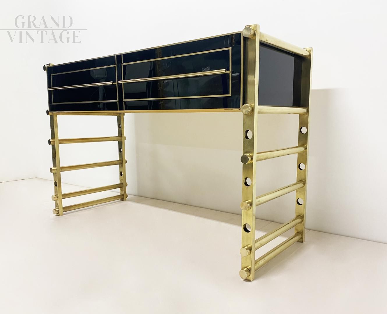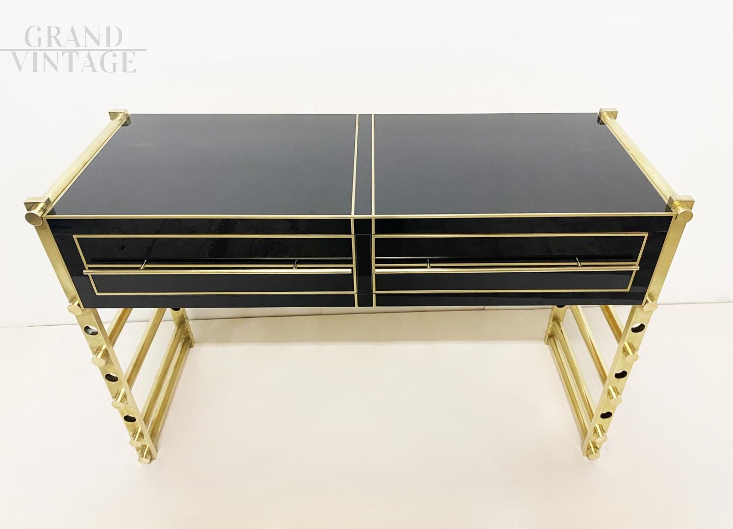 Elegant modern design console desk in black glass with brass legs, interior in ebonized wood with brass edges. Provenance: Italy 70s. Pair available.