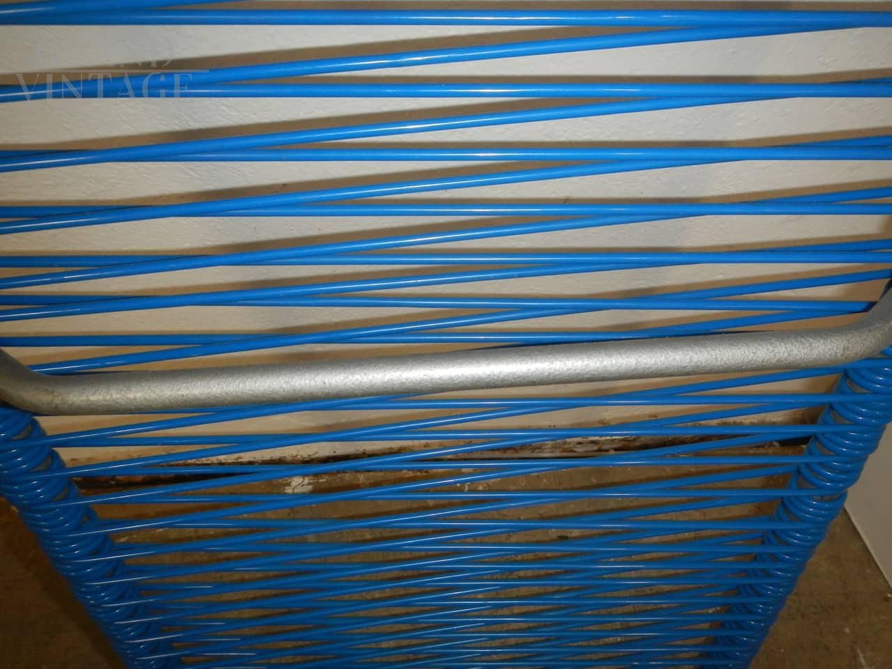 Small vintage outdoor cot, children size, with metal frame and blue plastic rope seat, 1970s.