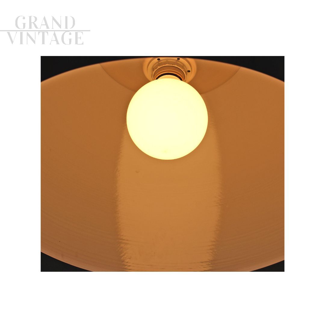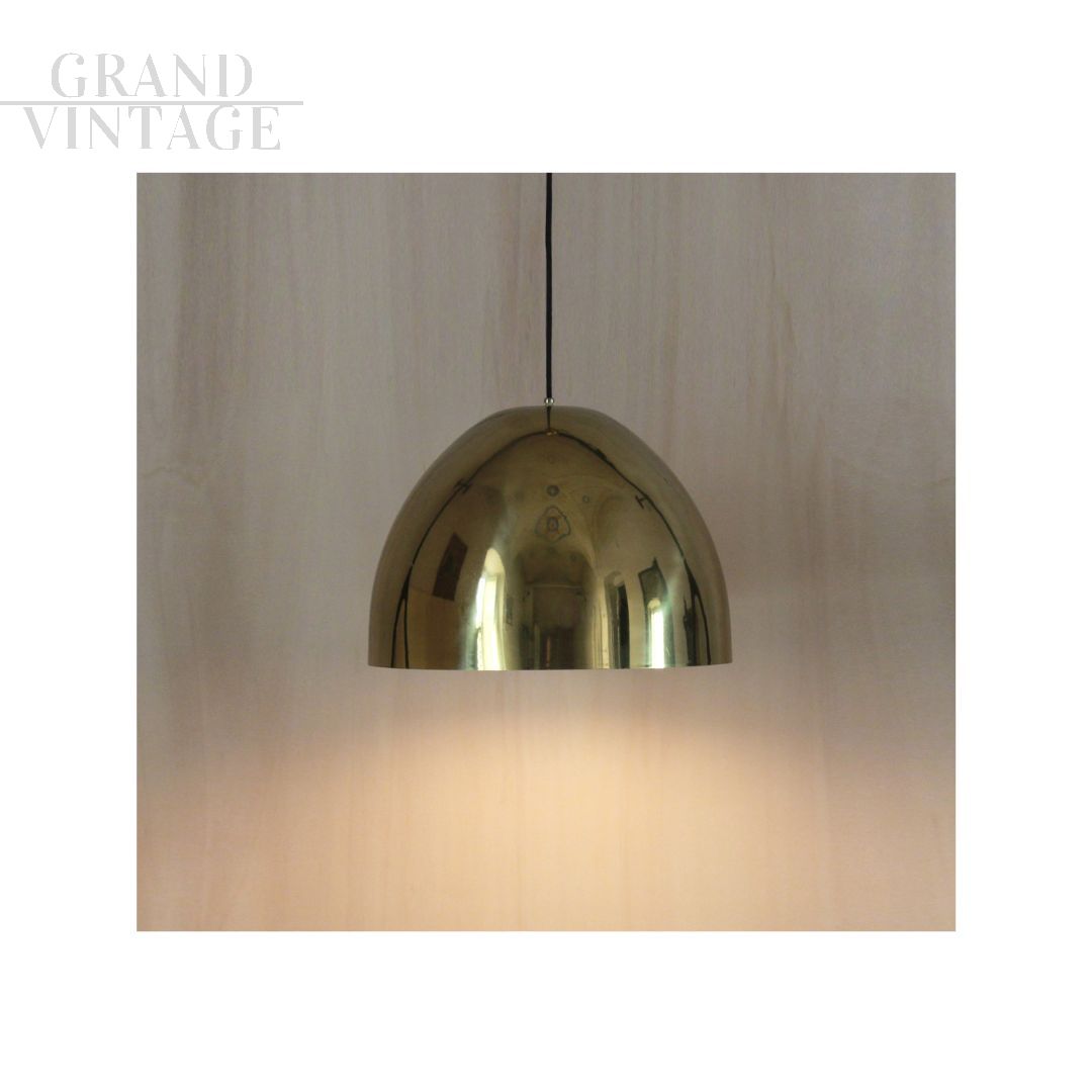 Vintage golden brass chandelier produced in Italy in the 1960s - 1970s with a hemispherical shape, with the internal part enamelled in white. Serviced by an electrician, it is in perfect working order. In very good condition, with small signs of aging. The height refers to the size of the lampshade.