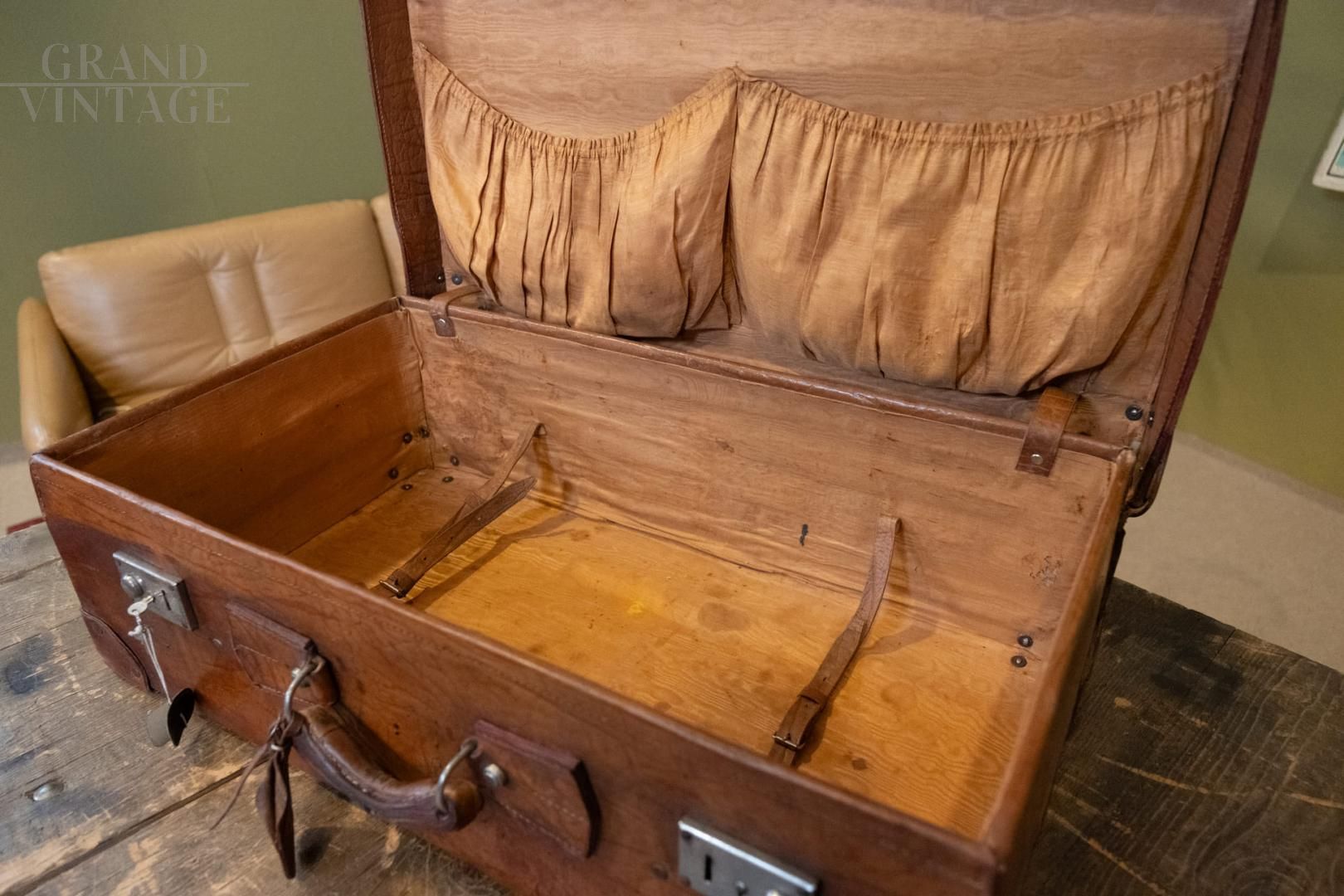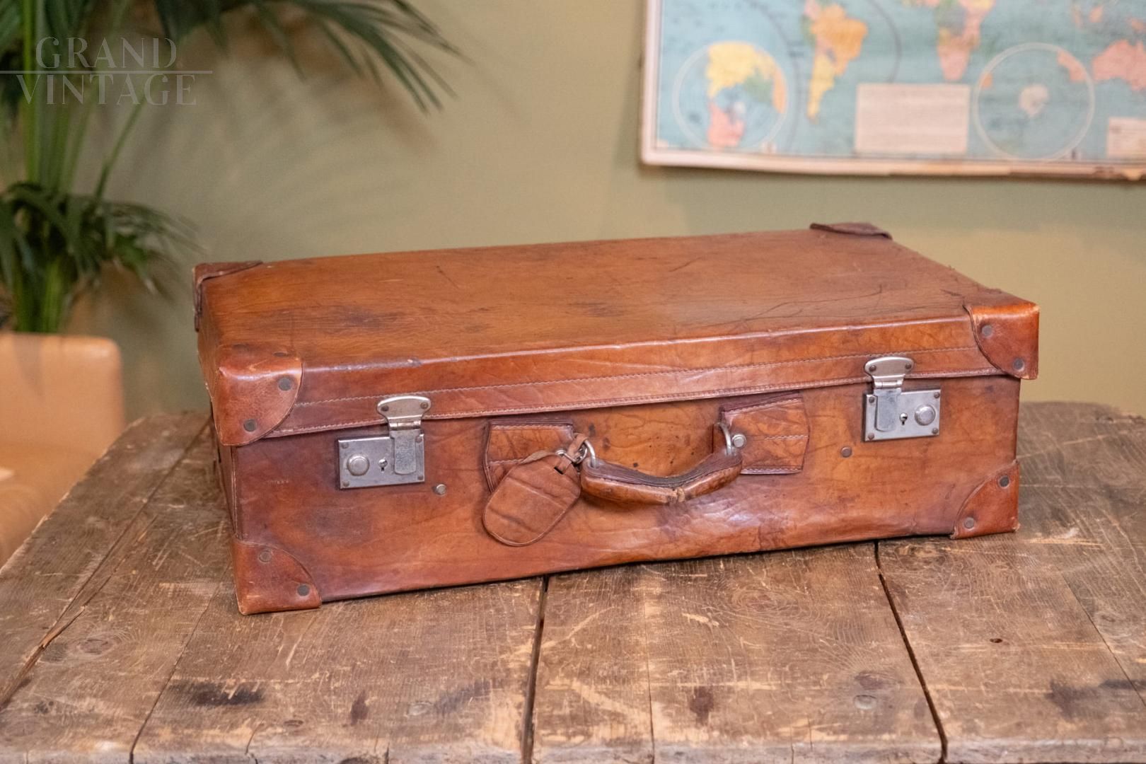 Elegant vintage suitcase in natural leather, with internal compartments and complete with key, perfect for those looking for a sophisticated and resistant accessory. A must for vintage lovers.