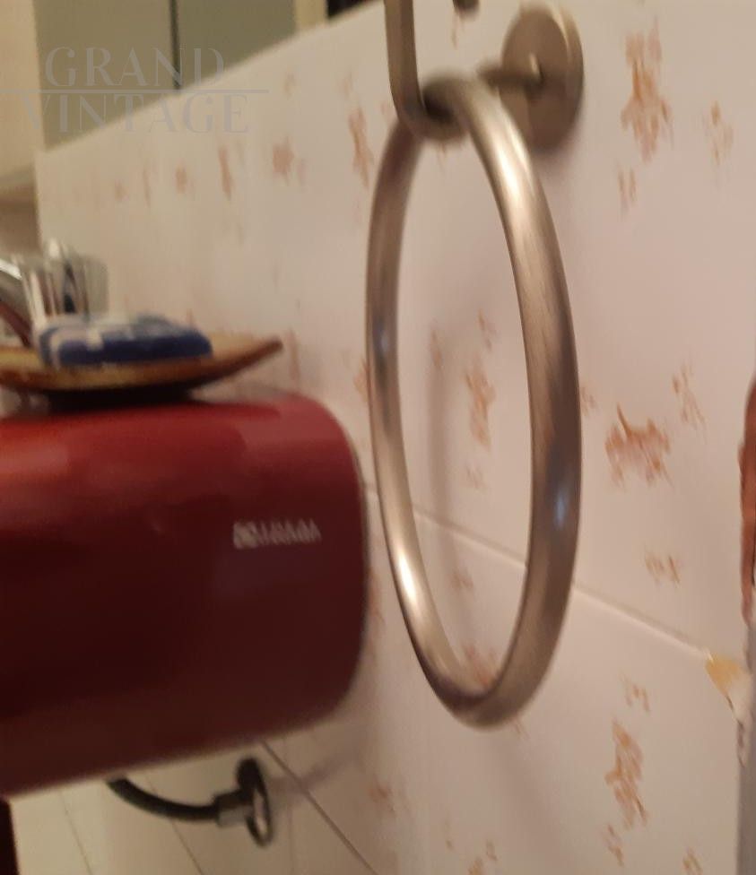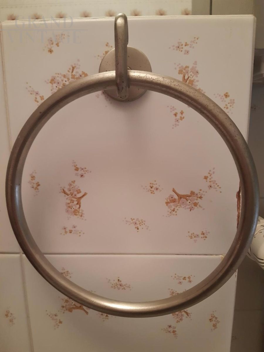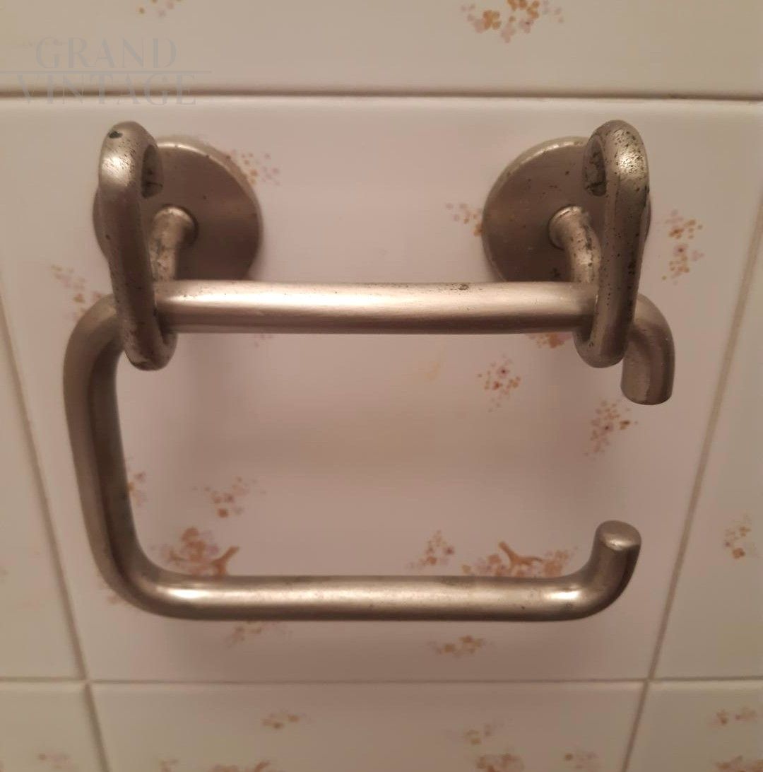 Brushed stainless steel bathroom accessories with clean, essential lines – a vintage set from the early 1990s in excellent condition. This stunning collection includes a towel ring, two towel bars (one short and one long), and a toilet paper holder. Made in the early 1990s, these vintage bathroom accessories feature a minimalist and timeless design that fits perfectly in both retro and modern settings. The brushed steel finish lends a subtle industrial touch, maintaining elegance and versatility. All pieces are in excellent vintage condition, with minor signs of wear that enhance their authenticity. Perfect for adding personality to your bathroom with a unique and functional set.