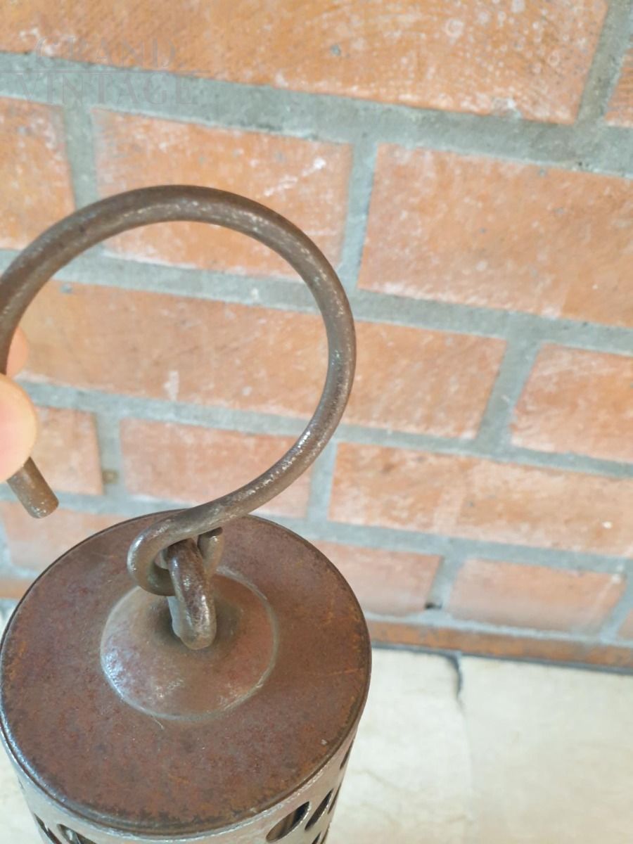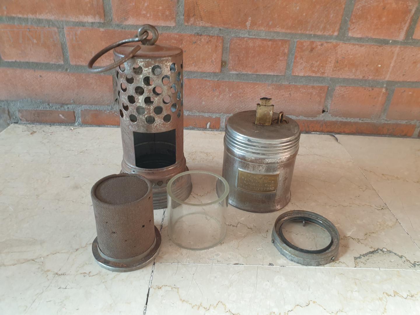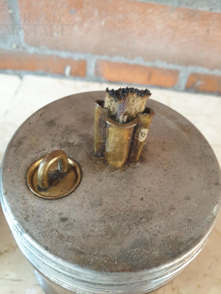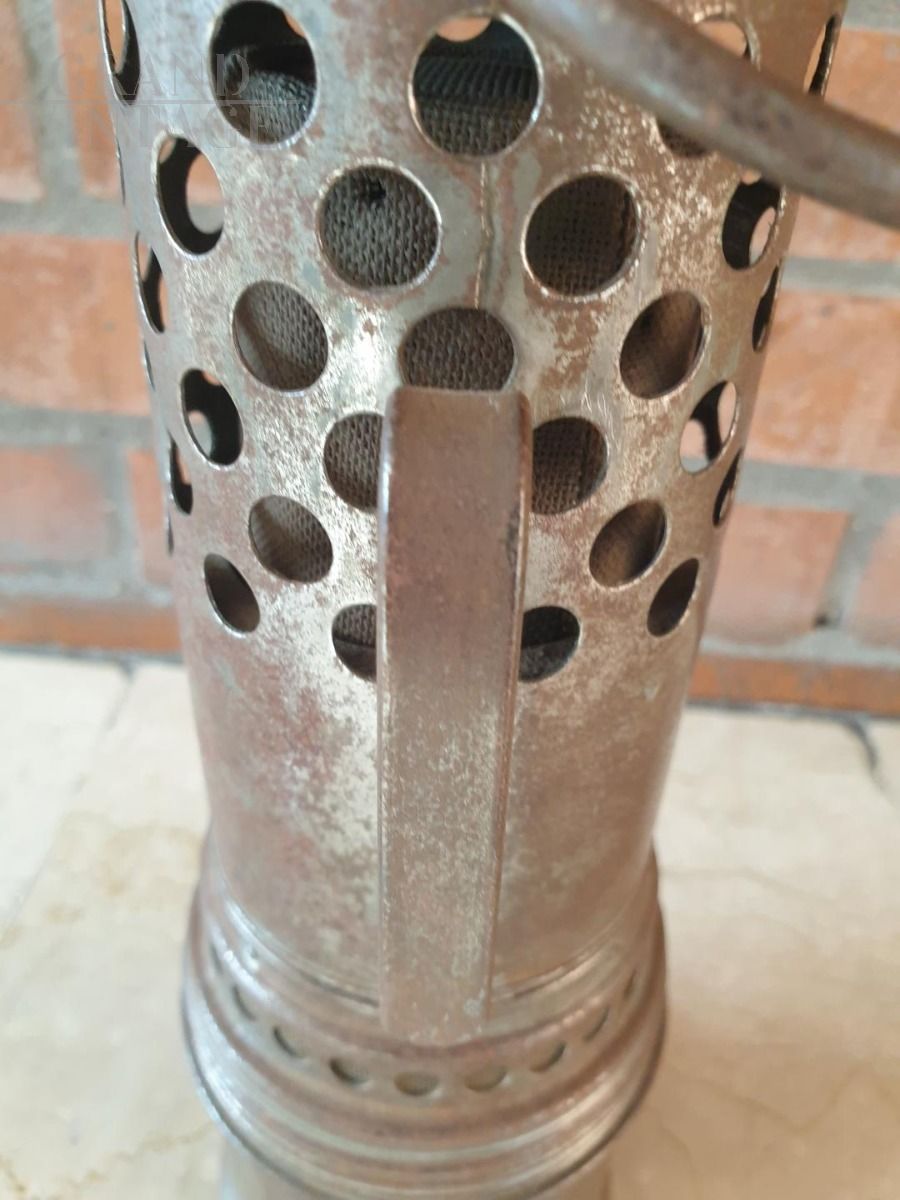 The lamp was placed under the radiator of the car to ensure it did not freeze in the winter, in a time before antifreeze existed. The lamp is manufactured by "The Wolf Safety Lamp Co Ltd" in Sheffield, England in 1925. The body is made of stamped galvanized steel, the base acts as a fuel tank, which can be petrol or Scottish naphtha. Brass screw cap. The lighter is mounted near the double wick tube and is operated by a spring-loaded handle. This controls the movement of a pin, which can be pushed up so that the spark immediately lights the wick when the handle is turned. The wick adjustment is controlled by the base. The chimney screws into the container. The lamp is supplied with a bracket and a hook.