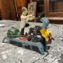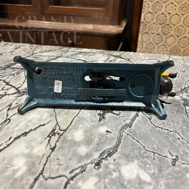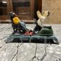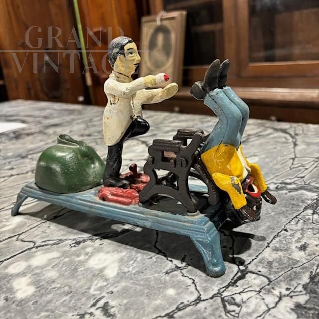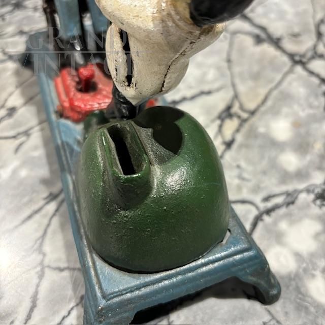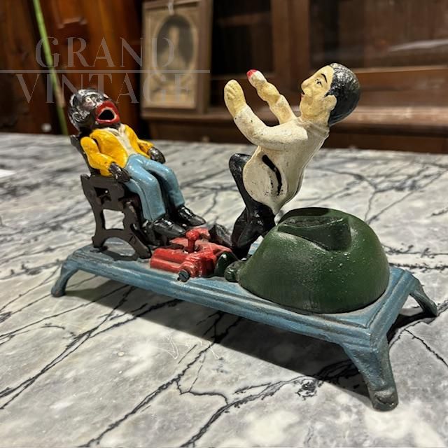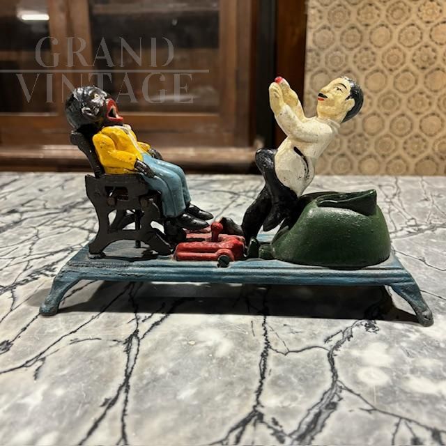 Vintage American hand-painted cast iron piggy bank with mechanical mechanism, depicting two characters, USA 1970s. In good condition.