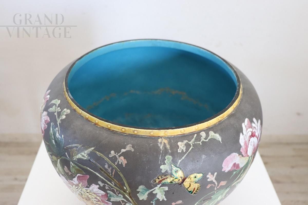Vintage ceramic vase painted with flowers, butterflies and birds