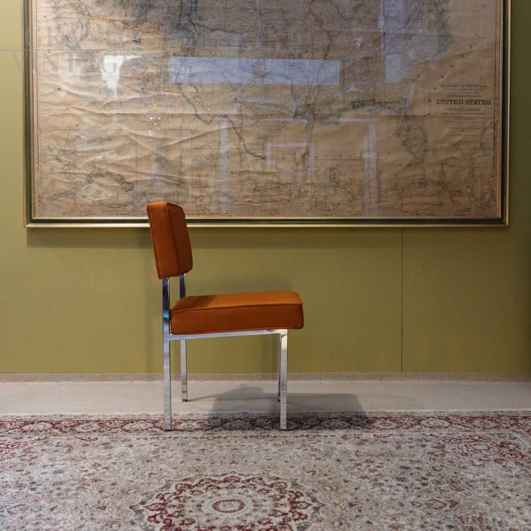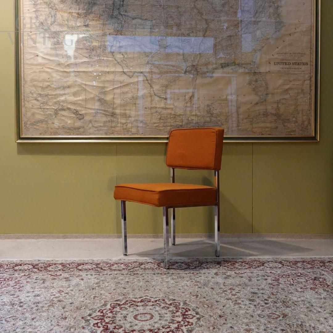 Mid-century modern chair in chromed metal and orange fabric, with an essential and versatile design. The solid structure and clean lines combine with a comfortable seat, making it perfect for dining rooms, contemporary kitchens or work environments with a minimal and functional taste.