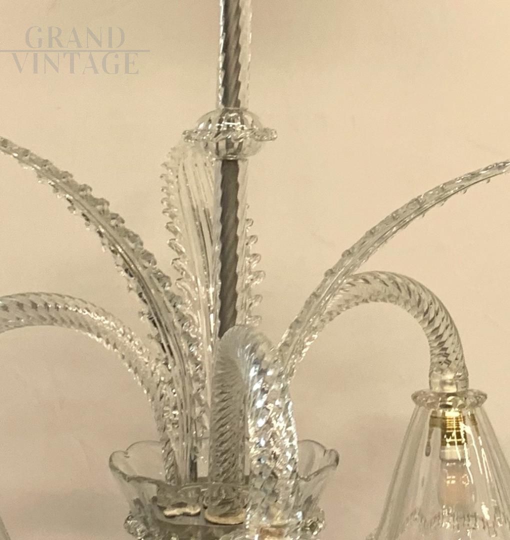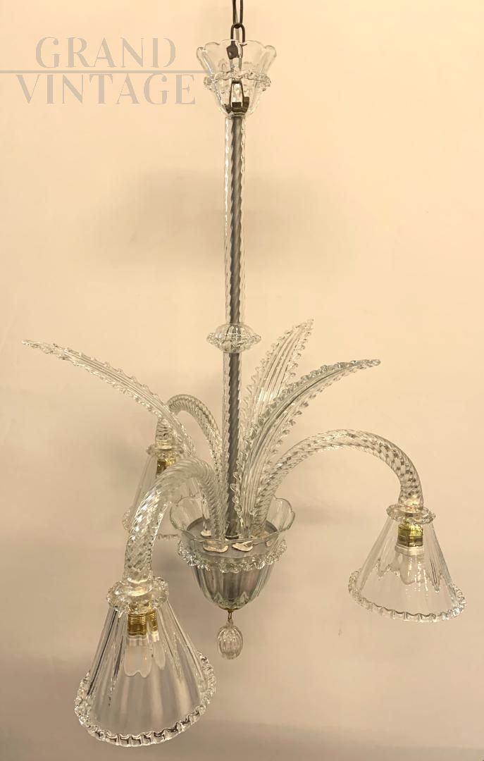 Elegant 1950s Murano chandelier attributed to Seguso with wooden and metal structure covered with wonderfully worked transparent Murano glass, characterized by three arms and three light points with bell-shaped lampshade, decorated with finely crafted leaves. The chandelier is in excellent condition, fully restored, with intact and uncracked glass. The three light points have connections for original E27 type bulbs, examined and tested with new internal electrical cable. The arms and leaves are removable to facilitate safe transport.
