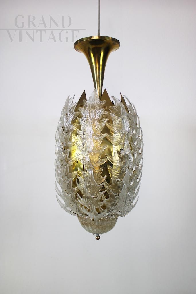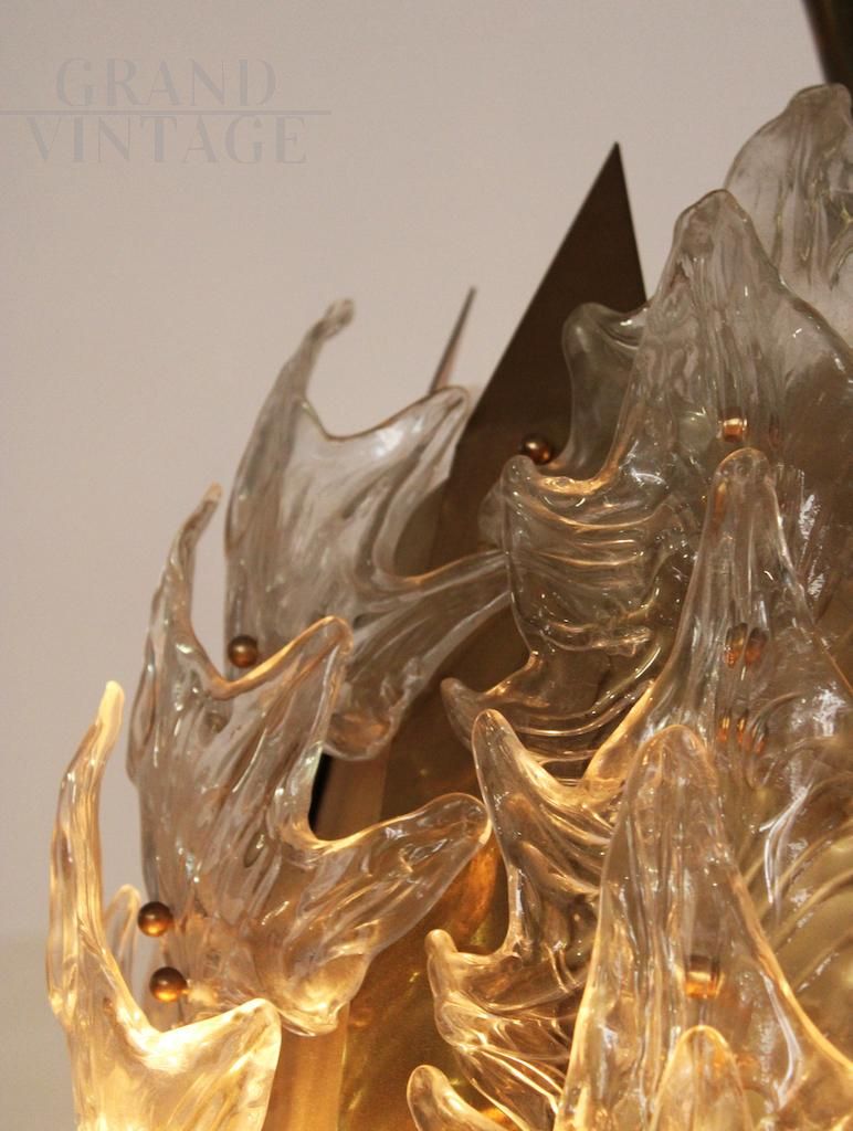 Particular vintage chandelier with brass structure covered in golden artistic glass leaves, Italy, 1970s.